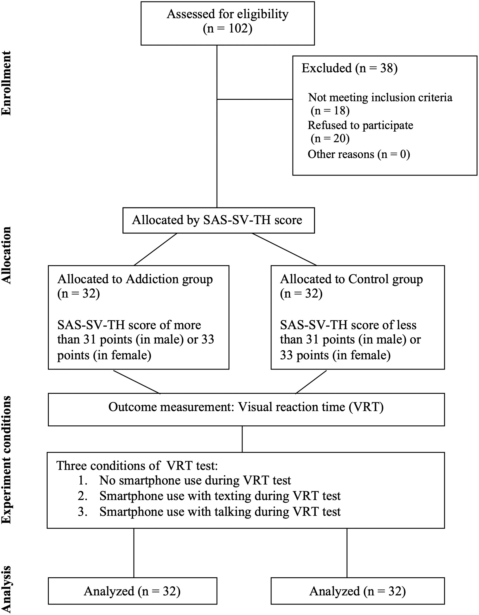The Smartphone Addiction Scale-Short Version (SAS-SV) was used to assign 64 undergraduate students to the smartphone addiction group (n = 32) and the control group (n = 32). The reaction time (RT) of an organism is used to determine how rapidly it responds to stimuli. All participants were examined on the RT test under three conditions: no smartphone use (control), texting, and chatting on a smartphone. Participants were questioned by smartphone through text message or chat with the support of a researcher during the texting and conversation conditions. While responding to the questions, the participant was administered an RT test.