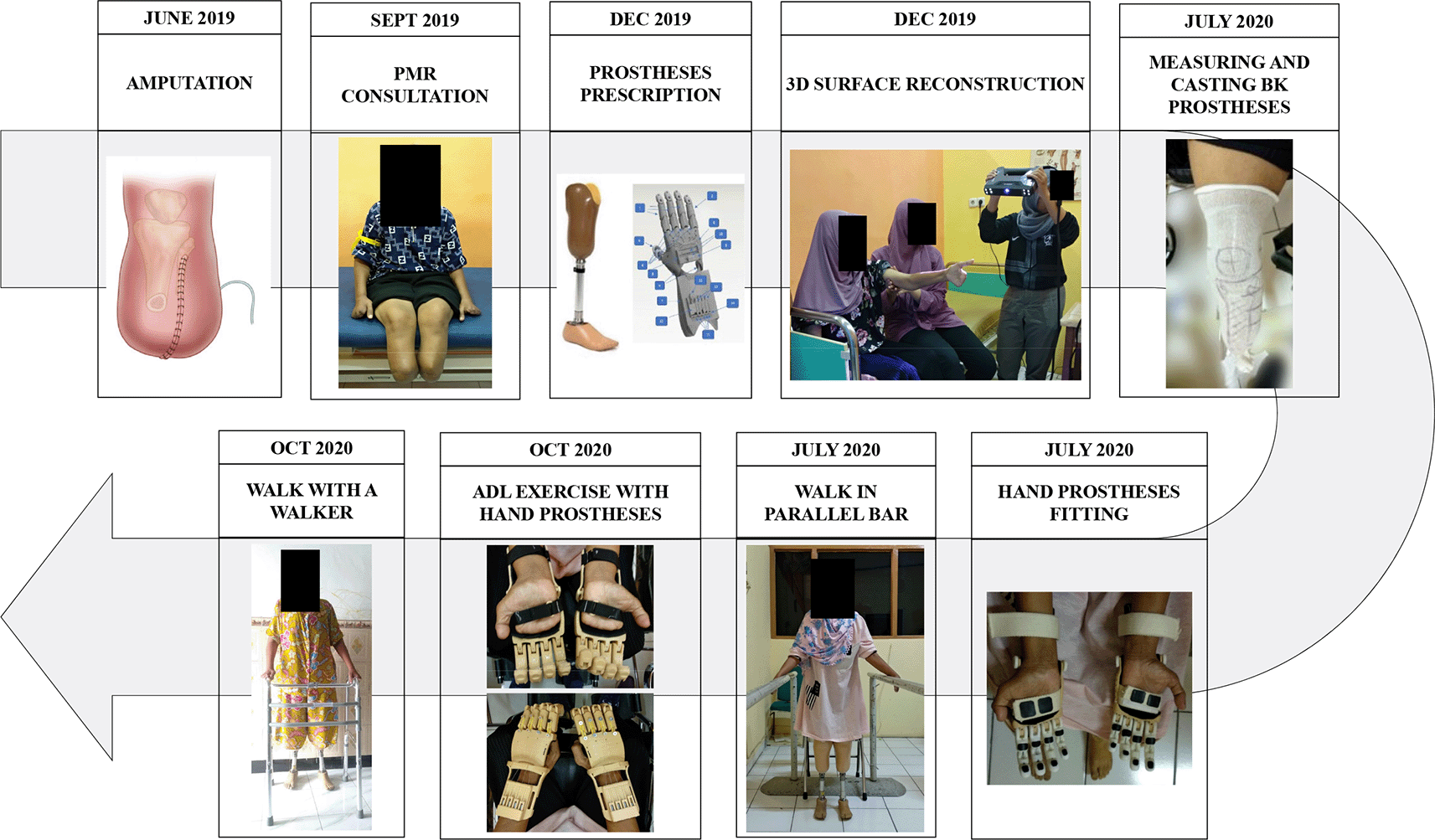 The muscle strength was measured using the manual muscle testing (MMT) method, and it was scored on a five-point scale.7 After examination, the muscles of her elbows, wrists, thumbs, hips, and knees were all weak, with the right wrist and thumb muscle strength remaining zero. Table 1 shows the detailed muscle strength examination results. Her right hand had a 20% sensory deficit. The condition of the partial-hands and below-knees stumps was quite good, except that there were still phantom sensations, and the pulse of the right radial artery was slightly weaker than the left side. For mobility, she still required the assistance of others with the wheelchair. The Barthel Index (BI) was 30 out 100, indicating that the patient was severely dependent8 As part of the rehabilitation programs, the patient received NMES on her right wrist and thumb with intensity until visible muscle contraction, ROM exercise for upper and lower extremities, sensory re-sensitization of the right hand, and pre-prosthesis preparation, namely gentle tapping on the stump, stump shaping using elastic bandage with figure of eight method, upper and lower extremities muscle strengthening, transfer exercise from bed to the wheelchair and vice versa, standing exercise with the knee and the forearm as the support, ADLs exercise and modification. Because the patient's home was far from the hospital, she underwent a home-based rehabilitation programs. She did the exercise for about 1-2 hours every day with the help of her family. The doctor would oversee the exercise via telephone and instant massage weekly. The weekly evaluation included adherence to exercise, complaints felt before and after exercise and evaluating the patient's ability to carry out daily activities. The patient would visit the Physical Medicine and Rehabilitation (PMR) outpatient clinic monthly to check her condition and evaluate the rehabilitation programs. Figure 1 depicts the rehabilitation timeline.