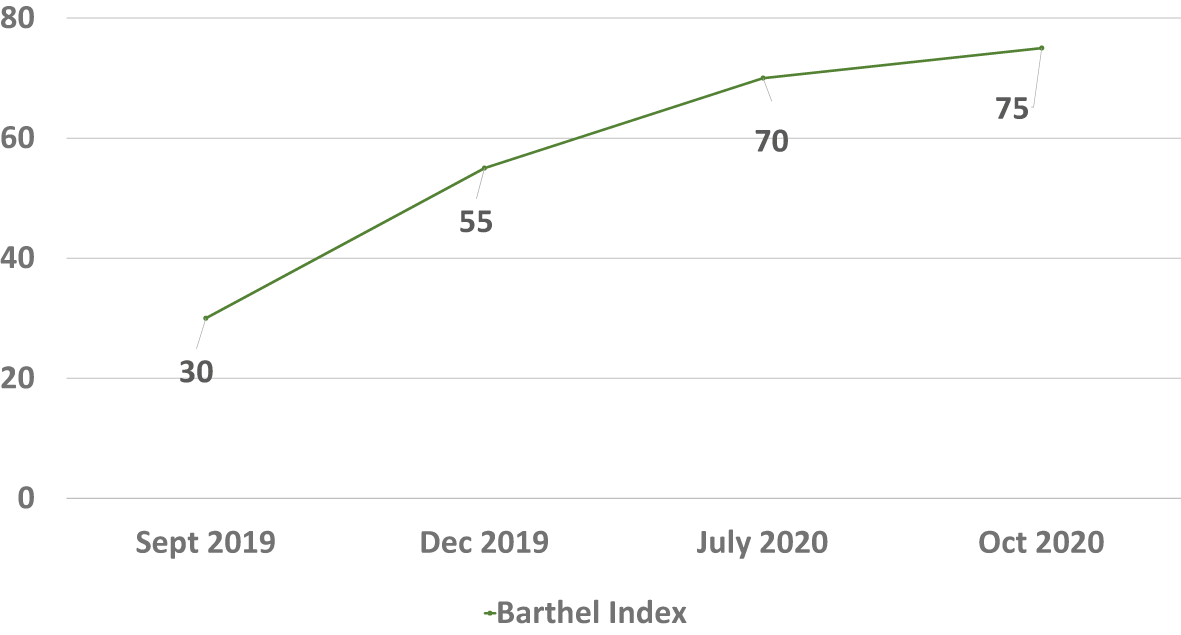 Unfortunately, due to the COVID-19 pandemic, the prostheses programs were delayed, but the patient continued to participate in the pre-prostheses home rehabilitation programs. In July 2020, the patient received her prostheses and began the prostheses rehabilitation programs. Standing balance exercises and gait training were added during this rehabilitation phase. To help with the gait training program, the patient’s family built a parallel bar in their home. She was able to do the gait training intensively for about two hours per day. In October 2020, the patient was able to walk with a walker and perform the majority of her ADLs independently, and her BI had improved (Figure 2). She could also work as a shopkeeper in her store and gained confidence in interacting with others.
