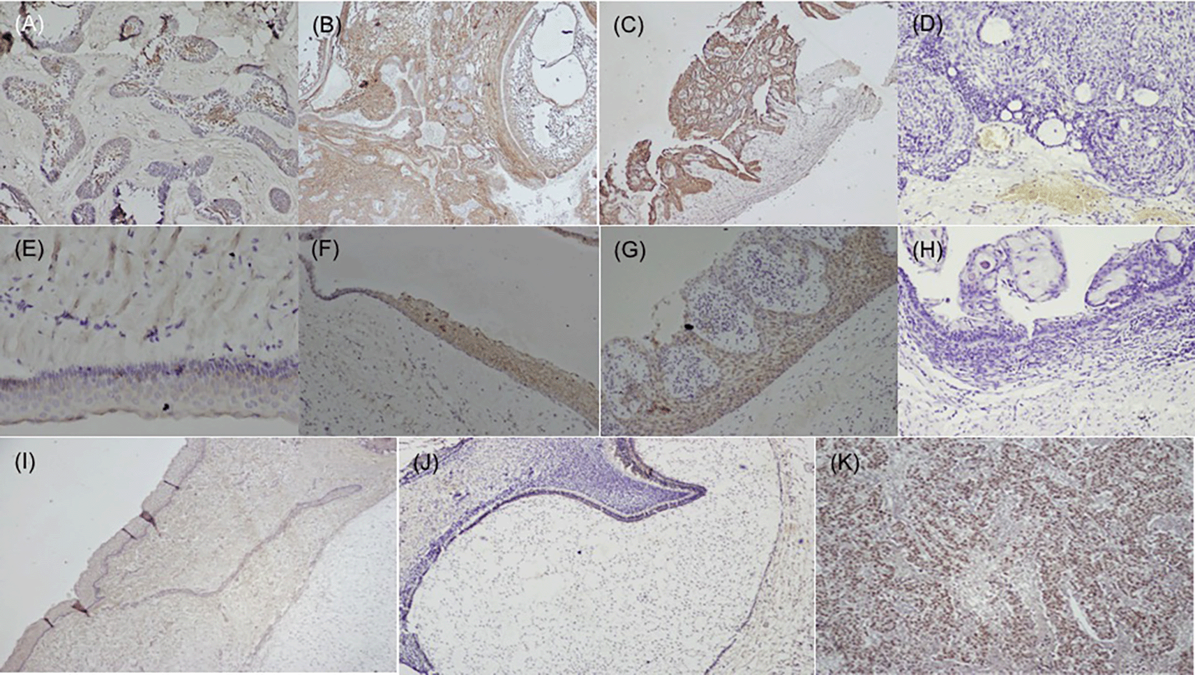 Histopathological variants of ameloblastoma: (A) Follicular (IHC, 10×), (B) Plexiform (IHC, 10×), (C) Unicystic (IHC, 10×), (D) Desmoplastic (IHC, 4×), (E) Focal immune-positivity for fascin in AOT (IHC, 10×), (F) COC (IHC, 10×), (G) OKC (IHC, 4×), (H) Dentigerous cyst (IHC, 10×), (I) Radicular cyst, (IHC, 10×), (J) Immuno-positivity for fascin in basal cells of the oral epithelium (IHC, 4×), (K) Oral squamous cell carcinoma used as positive control stained with fascin (IHC, 10×). IHC-Immunohistochemistry. The software used record images is Olympus-DP2BSW (ver 2.1).