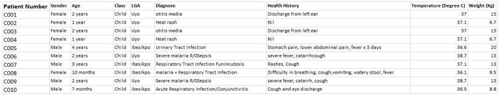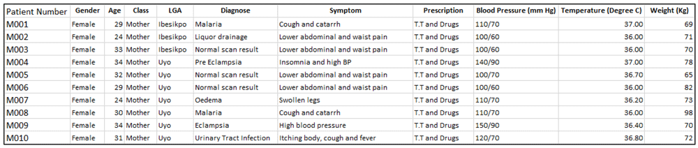 To capture the primary attributes for maternal, neonatal and child health, a data template (a table with attributes of the study), was designed with ethical considerations in mind. No sensitive information such as patient’s name was captured. Furthermore, patient’s location/address was truncated by removing street number, to avoid privacy and security implication. Maternal health data template had the following attributes (Date of visit, Gender, Class of patient [mother/infant/child], Address, Symptom, Diagnosis, Prescription, Blood pressure, Temperature, Weight). Neonatal health data template had the following attributes (Date of visit, Gender, Age, Class of patient, Address, Symptom, Condition, Height, Weight). Child health data template had the following attributes (Date of visit, Gender, Age, Class of patient, Address, Diagnosis, Health history, temperature, Weight). The description of these attributes is tabulated on Table 1.