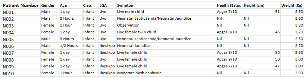 The total sample of data retrieved (before processing) included maternal (1063), neonatal (1367) and child patients (826), covering the 3 senatorial districts of Akwa Ibom State namely Uyo, Ikot Ekpene and Eket, and the 31 local government areas (LGAs) as presented on Table 2.