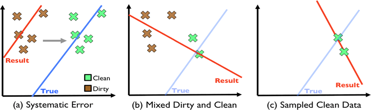The bulky and heterogeneous nature of Big Data requires investigation using Big Data Analytics (BDA). These data will yield meaningful outcomes by using methods of dissection in BDA,9 which help to discover concealed patterns, anonymous relationships, trends of the current market situation, consumer preferences and other aspects of data that can assist institutes and companies to make up to date, faster and better decisions for their business. However, the biggest issue with available datasets is the data quality itself. The data quality issues differ depending on the data source; they could be duplicated records, spelling errors or more complex issues relating to unit misuse. A mixture of clean and dirty records in data can mislead to the well-known Simpsons Paradox12,13 in which a pattern appears in a particular dataset but disappears or reverses when datasets are combined. A mixture of dirty and clean data could poorly fit an ML model; Figure 1 shows the different ML models fitting with different sets of mixed data. This would lead to unreliable analysis results. Hence, data pre-processing is an important factor in the data analysis process.