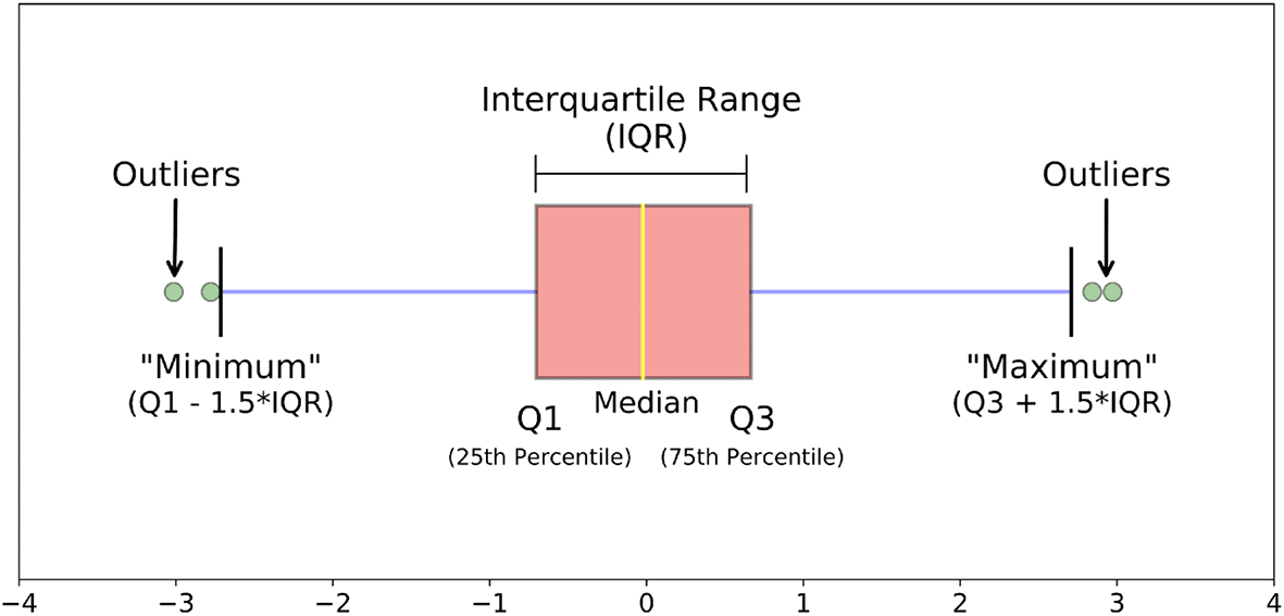 IQR, or midspread, or middle 50%, is the statistical dispersion equal to the range from lower quartile (25th percentile) to the upper quartile (75th percentile). The values that do not reside within the range of the minimum and maximum value are defined as outliers (Figure 2).