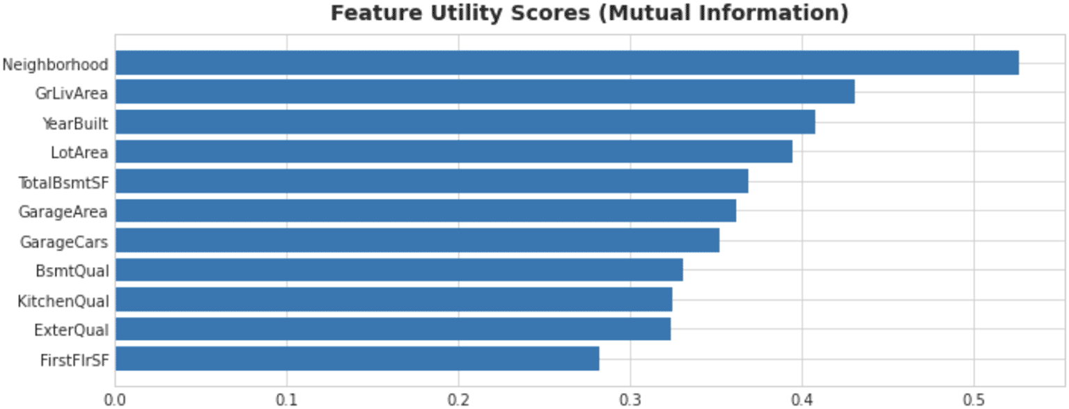 Using mutual score is a great way to determine a feature’s potential. Feature utility scores help to determine important features and non-important ones as well. Based on scores, we discarded some features for a performance gain.