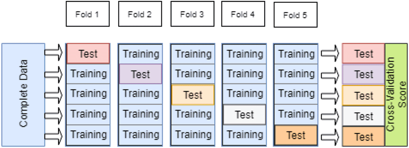 We adopted the K-fold cross-validation for performance evaluation. Cross-validation divided the data set into training and a testing data set to train the model and test its performance using two distinct data sets. Training and testing on the same data create overfitting issues. To avoid this, we used K-fold cross-validation with a value of 5 for K (Figure 4). All our experimental results were five-fold cross-validated.