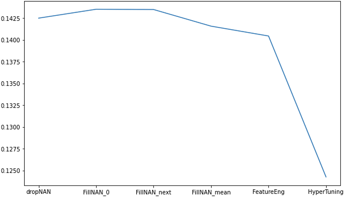 Hyperparameter tuning gave a performance boost in the final performance evaluation. Figure 5 shows the performance improvements after feature engineering and hyperparameter tuning. After fine-tuning some parameters, we obtained our highest RMSLE score with0.12426.