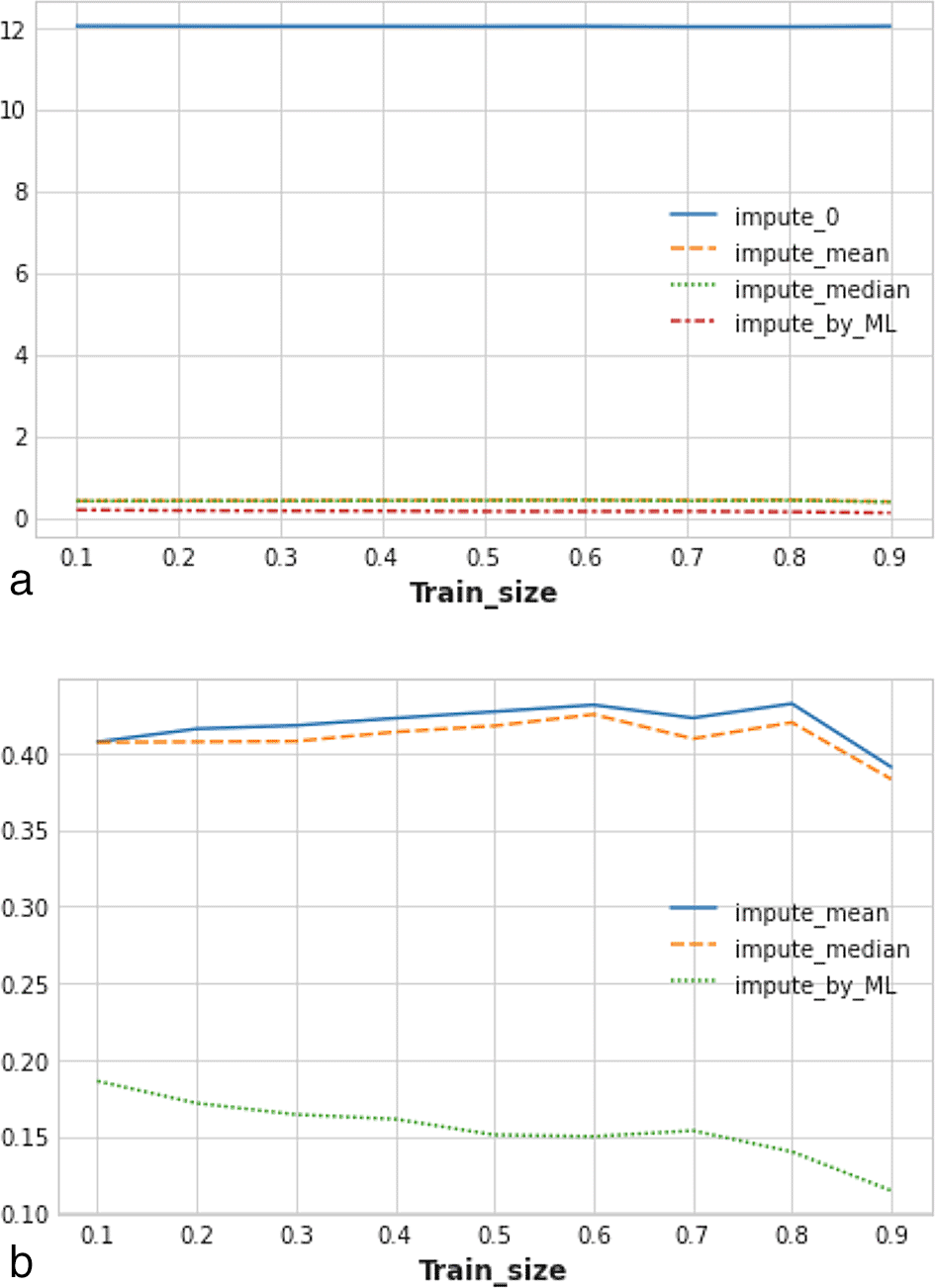 We calculated the mean RMSLE value of five trials of train/test splits while varying the training dataset size from 0.1 to 0.9 (10% to 90%). In Figure 6(b), we notice that the ML-based missing value imputation technique outperformed all other traditional imputation methods. Imputing 0 in place of the missing value performed worst in our experiment (see Figure 6a). Replacing missing values of any feature column with the median of that column performed slightly better than imputing the mean of that feature column.