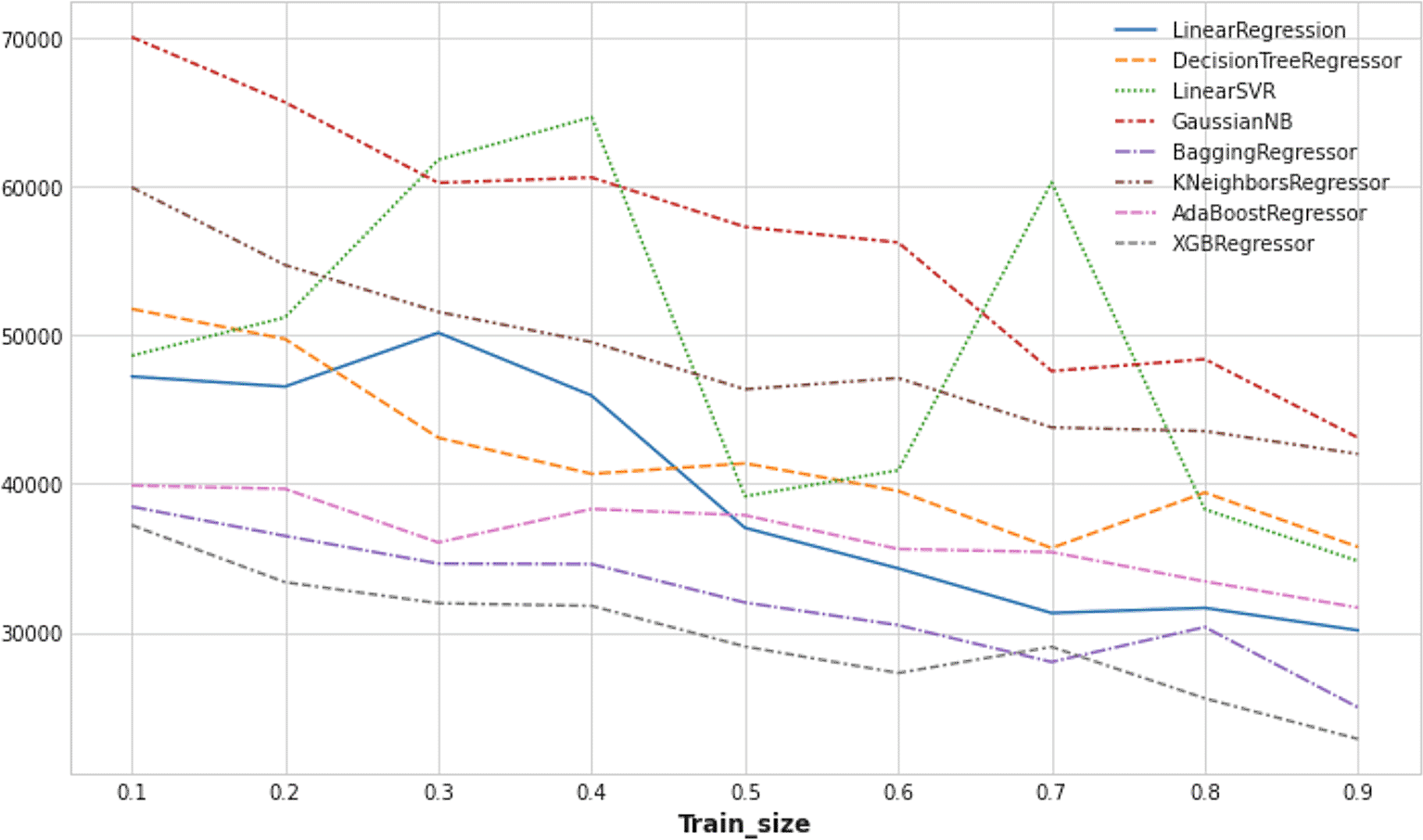 As the ML-based imputation technique outperformed state-of-the-art baseline methods, we evaluated missing value imputation performance of different ML models, such as LinearRegression, DecisionTreeRegressor, LinearSVR, GaussianNB, BaggingRegressor, KNeighborsRegressor, AdaBoostRegressor, XGBRegressor, among others. Although all ML models delivered higher accuracy with the continuous increment of training dataset size, we saw (Figure 7) more uniform and sheer increasing patterns in XGBRegressor and BaggingRegressor models. It proves that with sufficiently large datasets, the XGBRegressor model can outperform the other ML methods. In addition, we noticed that the XGBRegressor model showed a more stable performance with the varying training data size.