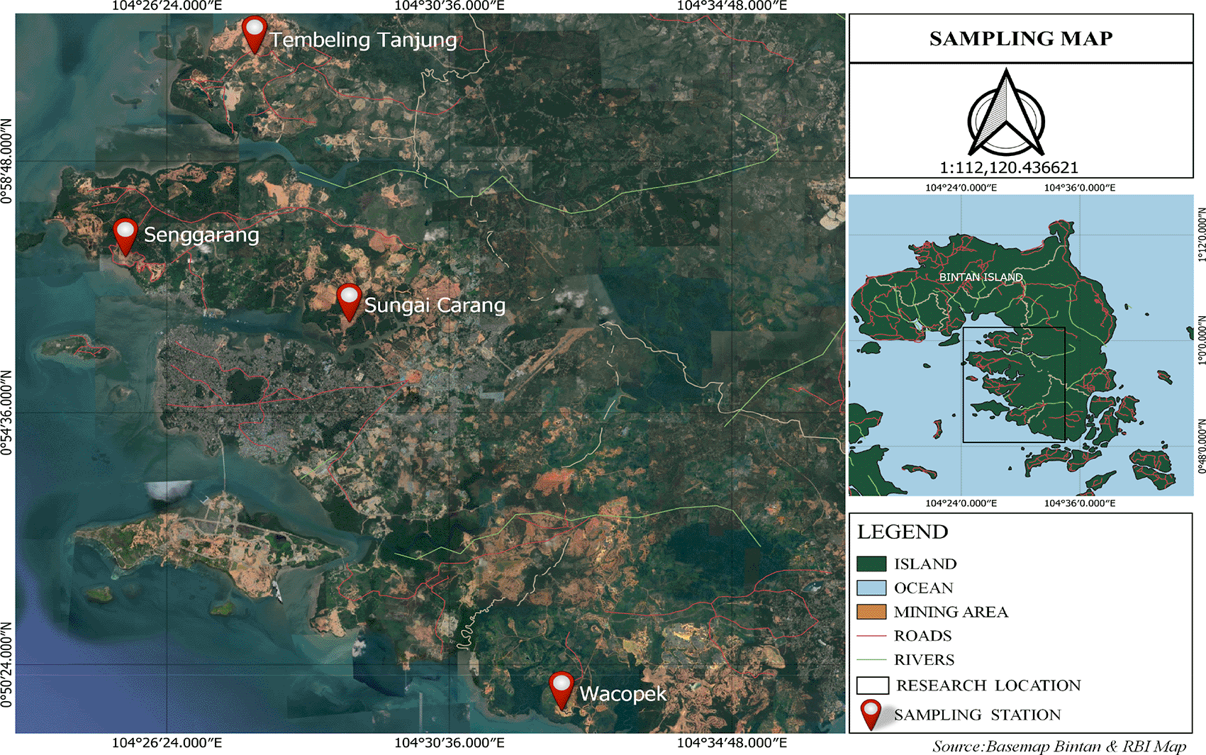 The research was carried out from June to November 2021 in Bintan Regency (Tembeling Tanjung and Wacopek Villages) and Tanjungpinang City (Senggarang Village and Air Raja Village) as presented in Figure 1. The location of the former bauxite mine is visible with reddish-yellow land openings with Mangrove ecosystem still found around the area.