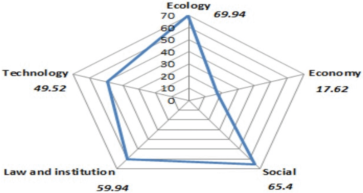 Table 2 shows that the small difference between the index values obtained from the MDS analysis and that of the Monte Carlo analysis indicates the relatively small scoring errors, relatively small variation in opinions, a stable repeated analysis process, and errors in data entry or lost data can be avoided. The results confirmed the validity of the MDS used in assessing the sustainability of mangrove forest management on Bintan Island. The validity of the results obtained from the MDS analysis was also demonstrated by the Goodness of Fit value, which was represented by the stress value and the coefficient of determination (R2) at the 95% confidence level. Table 2 shows that the stress value was less than 0.25 and the R2 value was close to 1, demonstrating the statistically valid results obtained from the analysis and the sufficient number of attributes used which represented the actual condition adequately. The attributes used in the analysis were sufficient to assess the sustainability of mangrove forests, whereby the results demonstrated a high level of confidence in the RApMEc analysis. The multidimensional sustainability indices are shown in Figure 2.