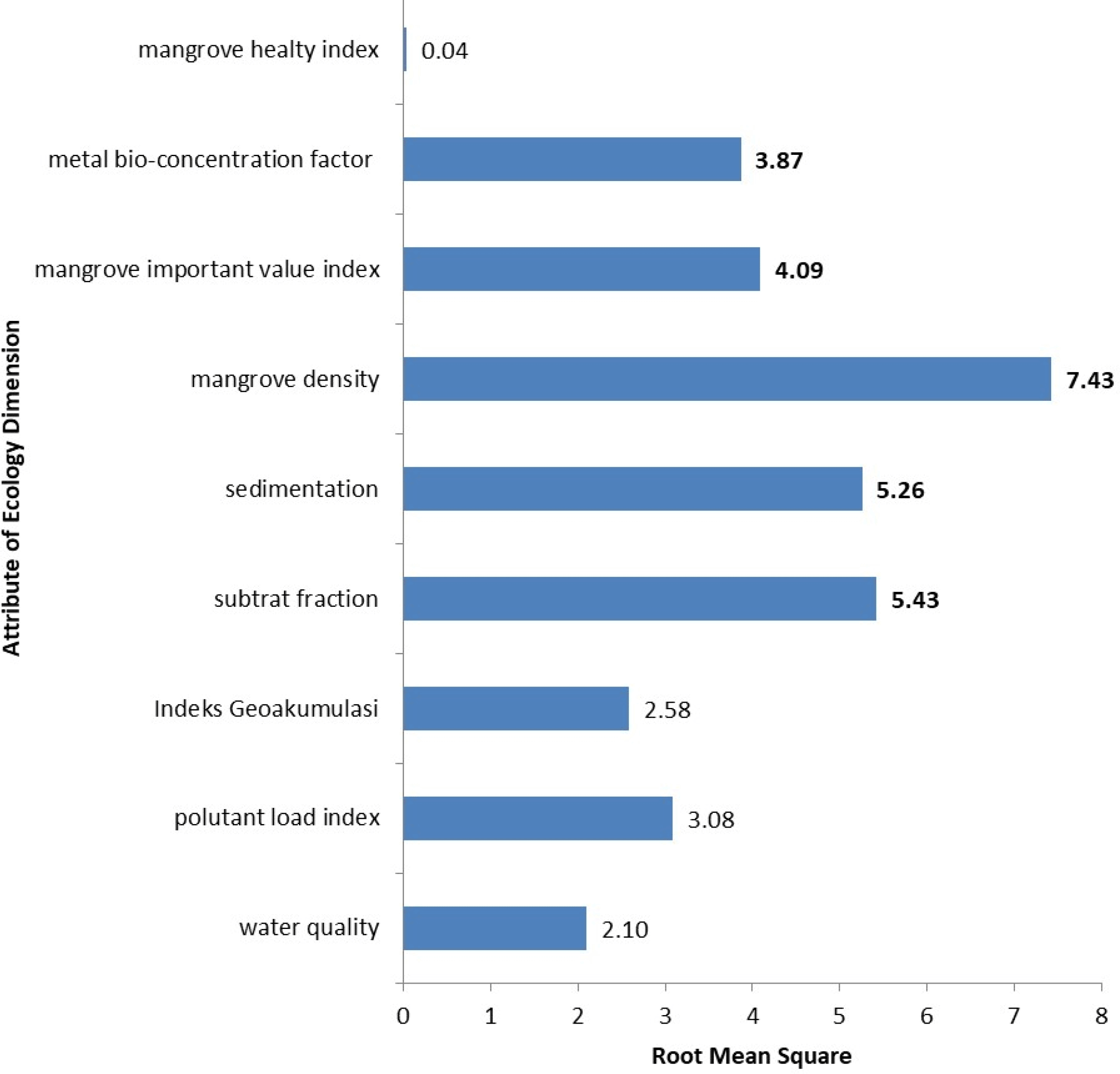 The sustainability of the ecological dimension is an indicator of the biophysical sustainability of mangrove forests related to environmental aspects such as physical, chemical, and biological. A sustainability index of 69.94 was obtained for the ecological dimension indicating quite a sustainable management in this aspect. This finding also demonstrates that the ecological dimension is sufficient to prove the sustainability in the mangrove forest management around the former bauxite mining area on Bintan Island. On the other hand, the leverage analysis revealed the five attributes related to the sustainability of the ecological dimension, namely 1) mangrove density, 2) substrate fraction, 3) sedimentation, 4) mangrove importance value index, and 5) metal bioconcentration factor. These attributes are presented in Figure 3.