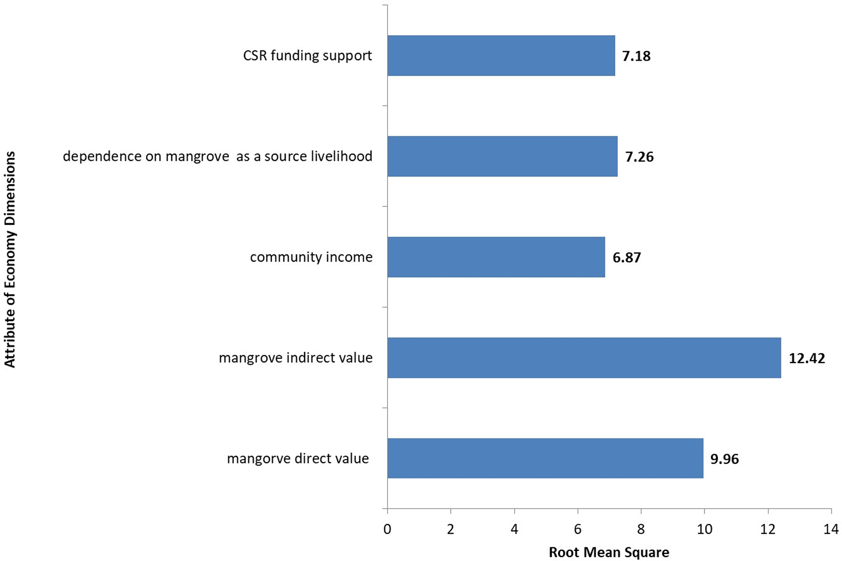 A value of 17.62 was obtained to represent the sustainability status of the mangrove forest around the ex-bauxite mining area on Bintan Island, indicating unsustainability (bad). This value demonstrates that the management of mangrove forests around the former bauxite mining area has been experiencing pressure from an economic standpoint. This pressure could be due to the poor ability of mangrove natural resources and the surrounding ecosystems to provide environmental benefits and services. The results obtained from the leverage analysis showed that all attributes are the levers that require attention in the management of mangrove forests. The graph of economic dimension leverage is presented in Figure 4.