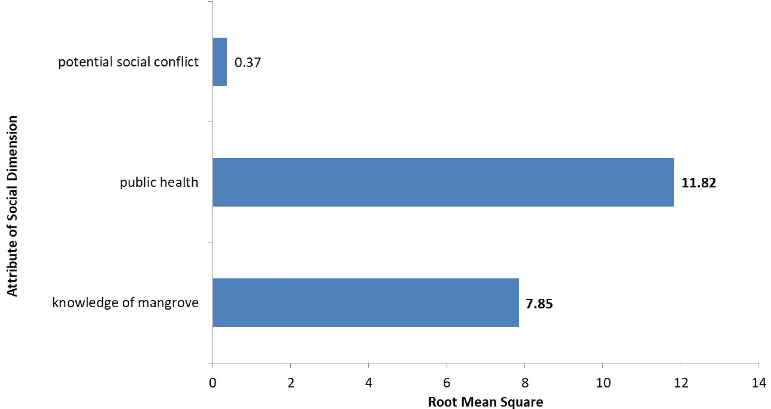 A value of 65.40 obtained from the analysis of the sustainability status of mangrove forests based on the social dimension indicated sustainability in the management. The level of public health and public perception of mangrove management were the two attributes that are sensitive and can greatly affect the social dimension. The graph of the leverage identified in the social dimension is presented in Figure 5.