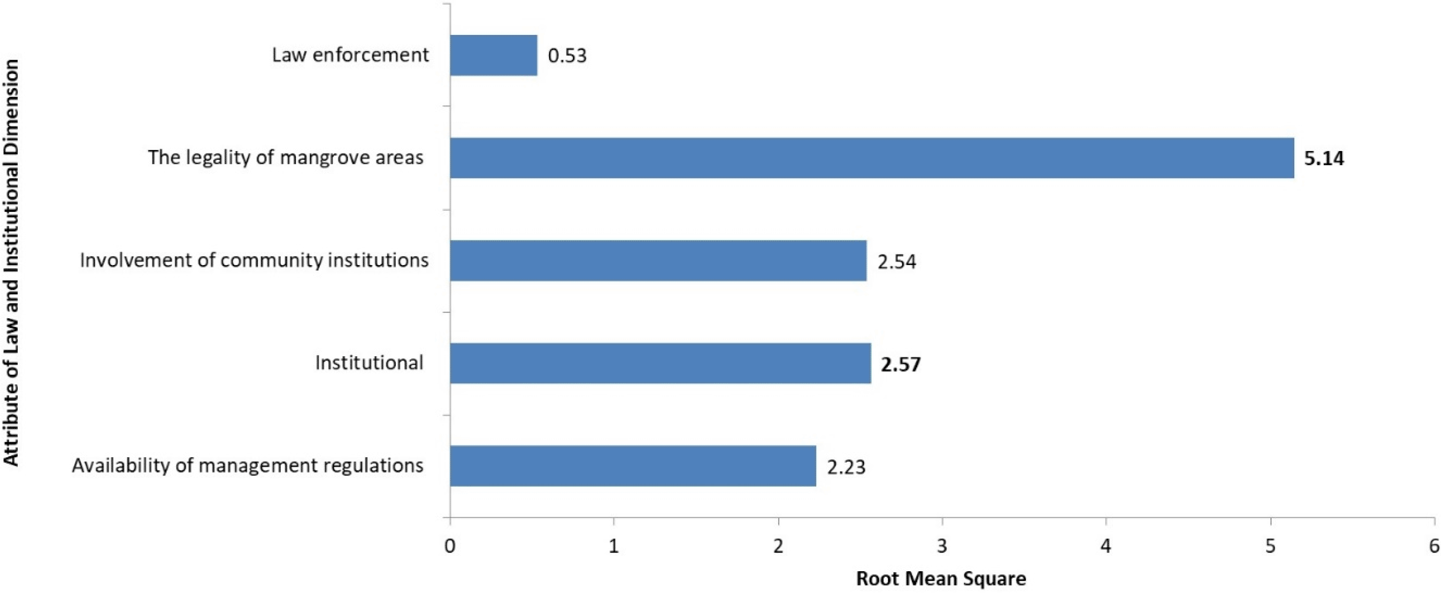 A value of 54.95 obtained from the analysis of the sustainability index for the legal and institutional dimensions indicated sustainability in the management. Based on the leverage analysis, only one of the five attributes, namely the legality of the mangrove forests and the bauxite mine was identified as the lever in the legal and institutional dimensions. The graph of the leverage is presented in Figure 6.