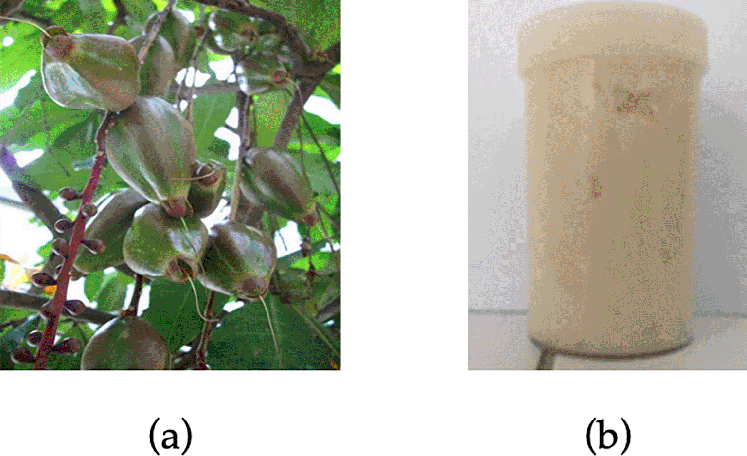 Gel formulation was prepared using Carbopol 940, triethylamine, propylene glycol, methyl paraben, and distilled water. Briefly, 0.2 g methyl paraben (0.2% w/w) was dissolved in 100 mL pre-heated distilled water (70°C), and then added with 2 g Carbopol 940 to form the gel. The mixture was stirred by hand until foam and gel were formed. Subsequently, 6 g propylene glycol (6% w/w) and 2 g triethylamine (2% w/w) were added into the gel solution. Lastly, B. racemosa kernel was added to gel formulation with a concentration of 1, 3, 5, and 7 ppm (mg/kg). The B. racemosa fruits and prepared gel formulation are presented in Figure 1.