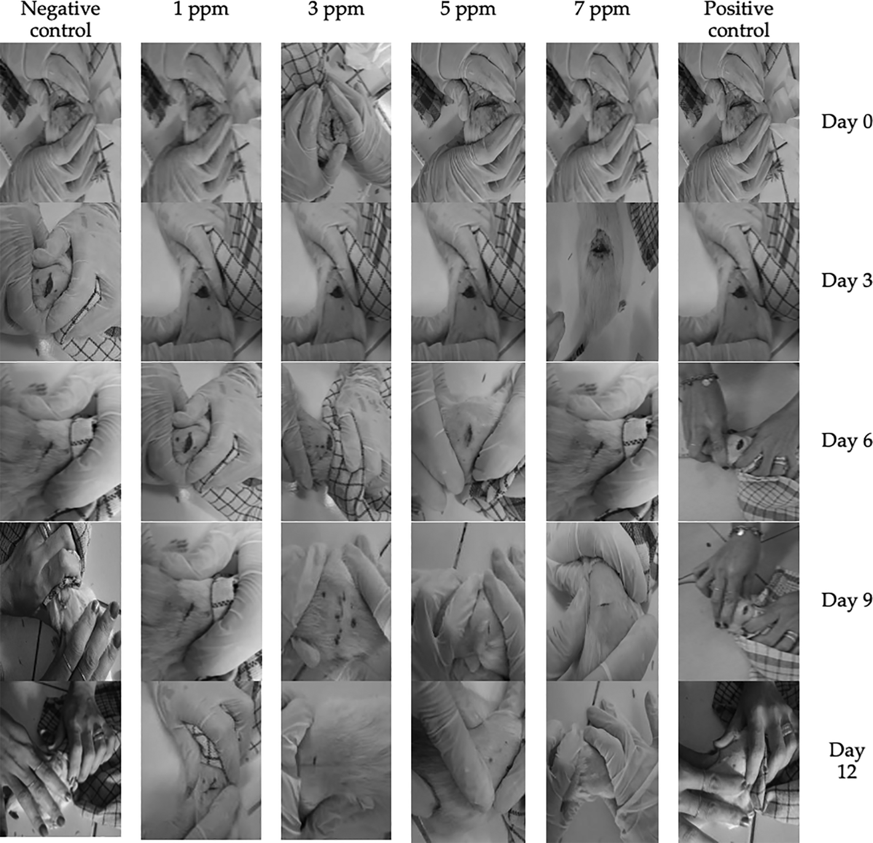After 12 days of observation, most of the wounds had reached remodeling phase. There were two rats in negative control group that experienced remodeling phase accompanied with persistent redness and healthy granulation (>90%), where no exudate, wounded area, and signs of inflammation (Figure 2). However, the two other rats in the negative control group still had 4 cm2 lesion. In all animals within 1 ppm of B. racemosa extract, the wound persisted with an area of less than 4 cm2 with no sign of infection and 95% of the wound had healthy granulation. When the concentration was increased to 3 or 5 ppm, the wounds were completely closed with granulation reaching 90% or more. Similar results were also obtained in the positive group. The fastest wound healing was found in treatment group receiving gel containing 7 ppm B. racemosa extract, where wound area and granulation were no longer observable (Figure 2).