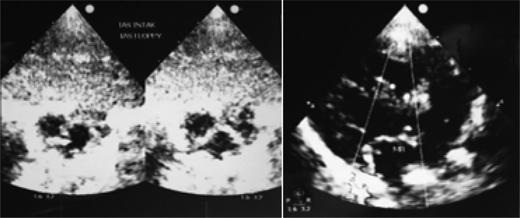 On the second day, the baby looked less active, moaned, showed acral cyanosis, and had a large fontanelle that was dilated and soft. Signs of hydrocephalus such as Macewen’s sign, setting sun phenomenon, and transillumination were found to be positive. From the babygram examination, neonatal pneumonia was suspected, while the echocardiographic examination indicated a floppy interatrial septum and mild mitral regurgitation (Figure 1). The non-contrast computerized tomography (CT) scan of the head showed a hypodense lesion according to the density of CSF filling the right and left hemicrania, while the hemi-cerebral cortex and lateral and third ventricles were not visible. Structures of the right thalamus, mesencephalon, pons and posterior fossa, and falx cerebri were still visible. The non-contrast CT scan of the head indicated hydranencephaly (Figure 2). From the toxoplasmosis, rubella, CMV, and herpes simplex virus (TORCH) screening examination, the results of anti-CMV immunoglobulin G (IgG) were 22 aU/ml (positive if the value ≥6) and anti-CMV IgM were 0.156 COI (negative if the value ≤0.7).