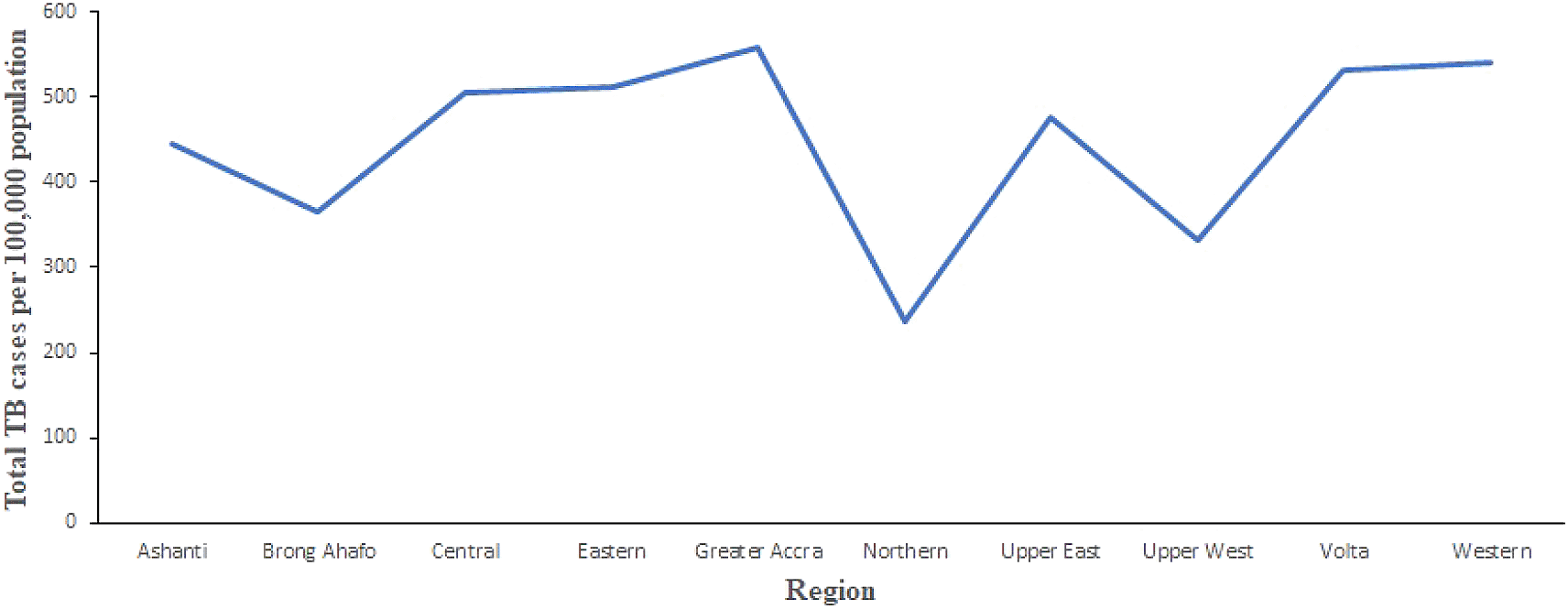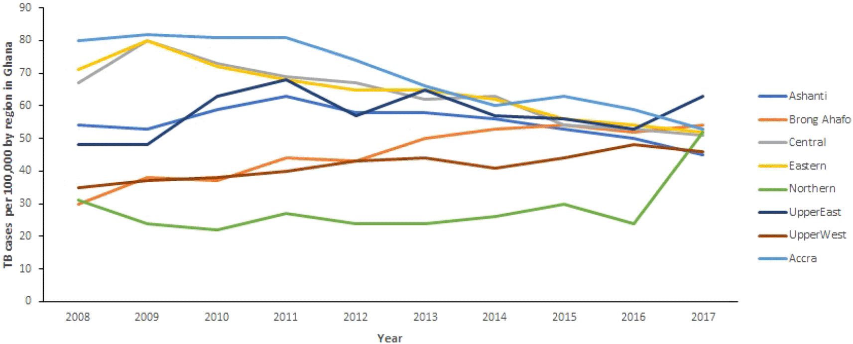 Figure 1 shows the TB trends in the 10 regions from 2008 to 2017. Generally, there is a decrease in TB cases observed in all regions (except Brong Ahafo Region where TB cases increase) of Ghana from 2008 to 2016. It can also be observed that TB cases in Northern and Upper East increased remarkably between 2016 and 2017, whereas cases in Ashanti Region decreased from 50 per 100, 000 population in 2016 to 45 per 100,000 population in 2017. In the Northern Region, TB cases increased from 24 per 100,000 population in 2016 to 52 per 100,000 population in 2017. Further, cases in Upper East Region increased from 53 per 100,000 population in 2016 to 63 per 100,000 population in 2017. However, the changes in TB cases in the other regions are almost horizontal.
