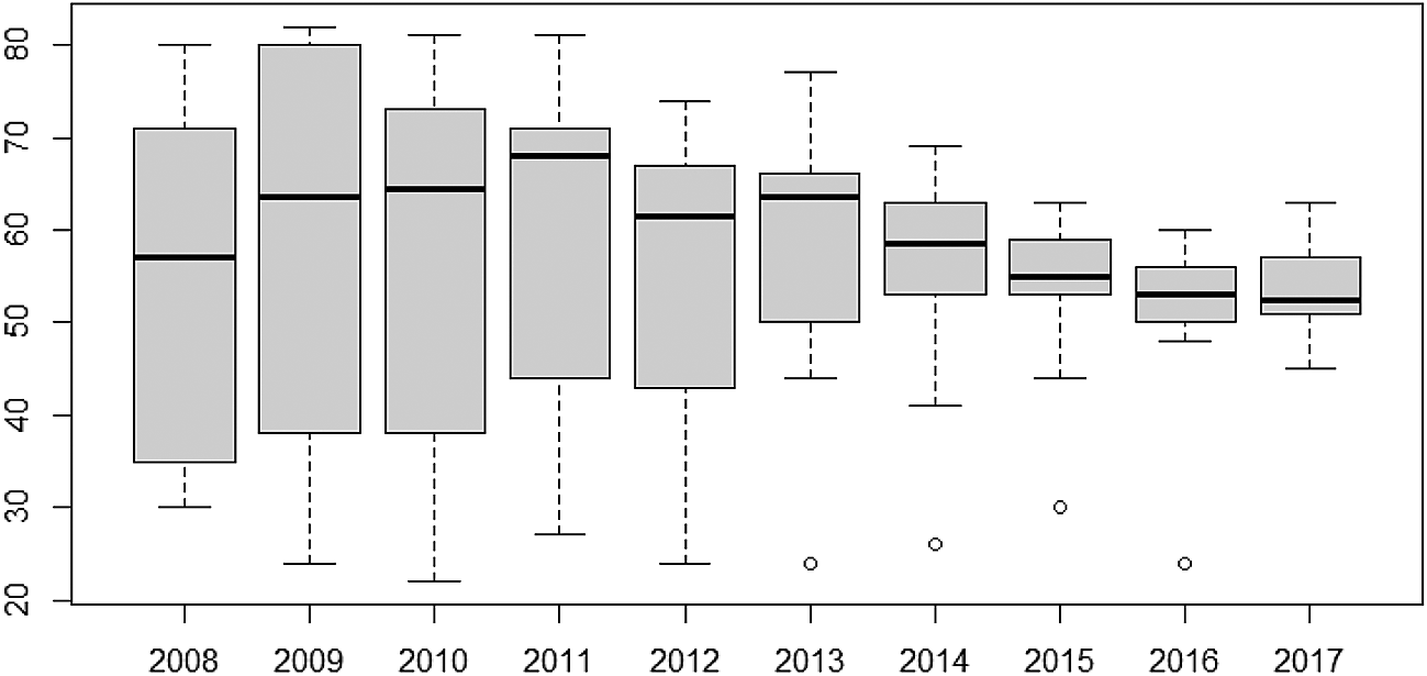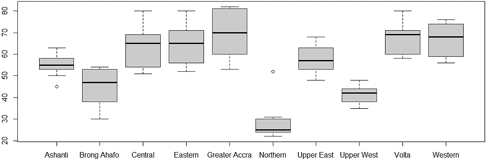 Furthermore, the variability of TB cases from 2008 to 2017 have also been presented using box-and-whisker plots in Figure 4. The overlapping box-and-whisker plots imply that there is no variability in cases among the years. The plots show that TB cases were skewed towards larger numbers from the year 2008 to 2014, and skewed towards smaller numbers from 2015 to 2016. Extremely small numbers were observed in 2013, 2014, 2015, and 2017. Variability across the regions have been presented in Figure 5. None-overlap of box-and-whisker plots imply variability between regions. Thus, there is variability in TB cases among the regions since some of the box-and-whisker plots do not overlap. It can also be observed that TB cases in most of the regions are skewed towards larger numbers except Northern and Upper East Regions (especially, the Northern Region with one extremely large value).