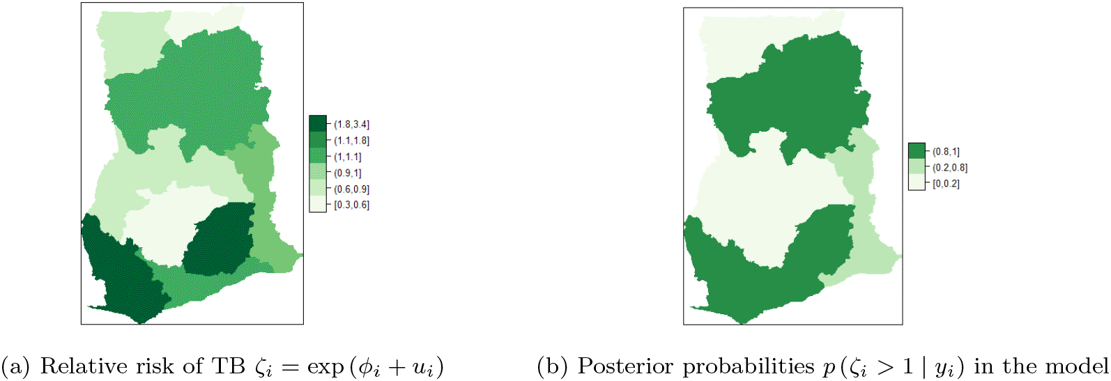 Figure 8a shows the map of spatial trend for the 10 regions and Figure 8b is the map of the posterior probabilities defined as Figure 8a shows that there is high risk of TB in the Eastern and Western regions. There is high risk (i.e. in the range 1.1-1.8) and clustering among the neighboring regions; Volta, Northern, Central, and Greater Accra regions. Upper East and Ashanti regions have the lowest risk (0.2,0.6) followed by Upper West and Brong Ahafo (0.6-0.9). The results account for the high variability captured by the unstructured component and the low variability captured by the structured component of the area-specific trend. The posterior probabilities in Figure 8b indicate low risk (below 1) and relatively low level of associated uncertainty.16 The time effect is not significant and there is no significant interaction between space and time. This observation accounts for the inaccuracy of Model II (i.e. Equation (10)) and Model III (i.e. Equation (9)) for the TB data.