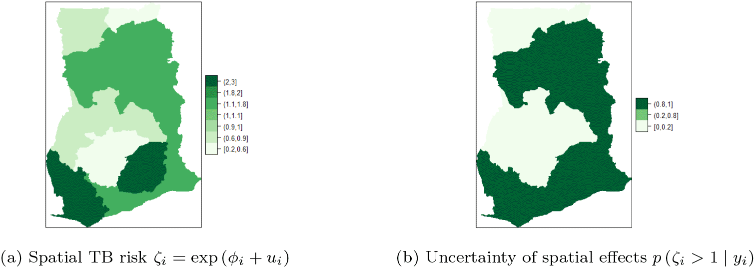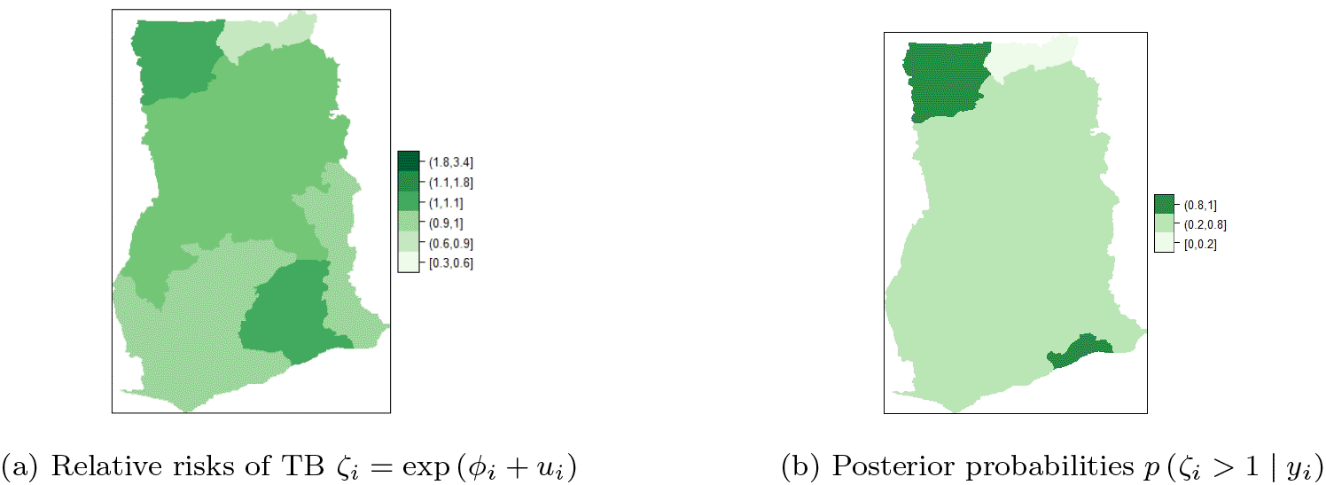 Among the baseline predictors stated in Section b, the significant predictors for TB cases in Ghana that yield accurate models include: HIV prevalence, TB cure rate, TB success rate, proportion of people with knowledge about TB, proportion of those who know that TB is airborne, proportion in high income group and literacy. Table 2 presents posterior estimates of the overall mean, fixed effects (i.e. ) as well as random effects (i.e. and ) for the unstructured and structured components of the BYM. The maps of the posterior mean for each region’s relative risk (i.e. ) are presented in Figure 7a and b. The risk can be visualized by computing .16