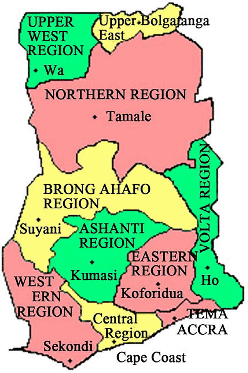 For this study, we utilized tuberculosis (TB) detection data sourced from the Ghana Health Service and National Tuberculosis Programme.9,13 The dataset comprises information on TB cases spanning the years 2008 to 2017, encompassing the 10 old administrative regions of Ghana. These regions consist of Ashanti, Brong Ahafo, Central, Eastern, Greater Accra, Northern, Upper East, Upper West, Volta, and Western, as illustrated in Figure 1. Although new regions were established after 2016, the TB data were collected and organized based on the original 10 administrative regions. One significant limitation is the reliance on existing data, which could contain errors if healthcare workers input information incorrectly. Additionally, using secondary data may compromise external validity if biases exist in the population under study. Another potential source of bias is non-random participant selection, which could make the estimates unreliable if the sample doesn’t accurately represent the entire population.