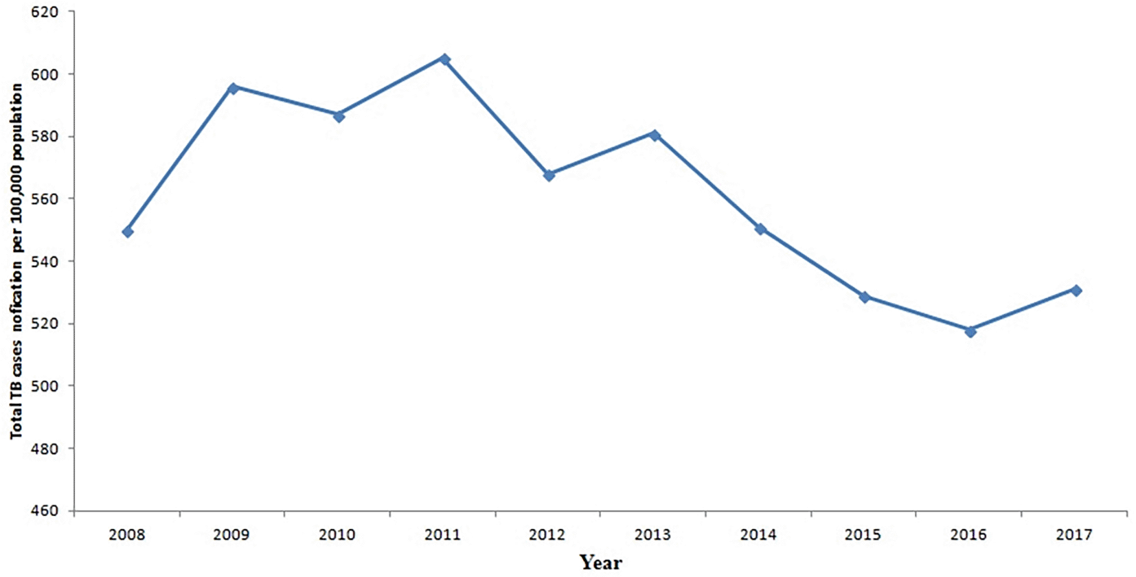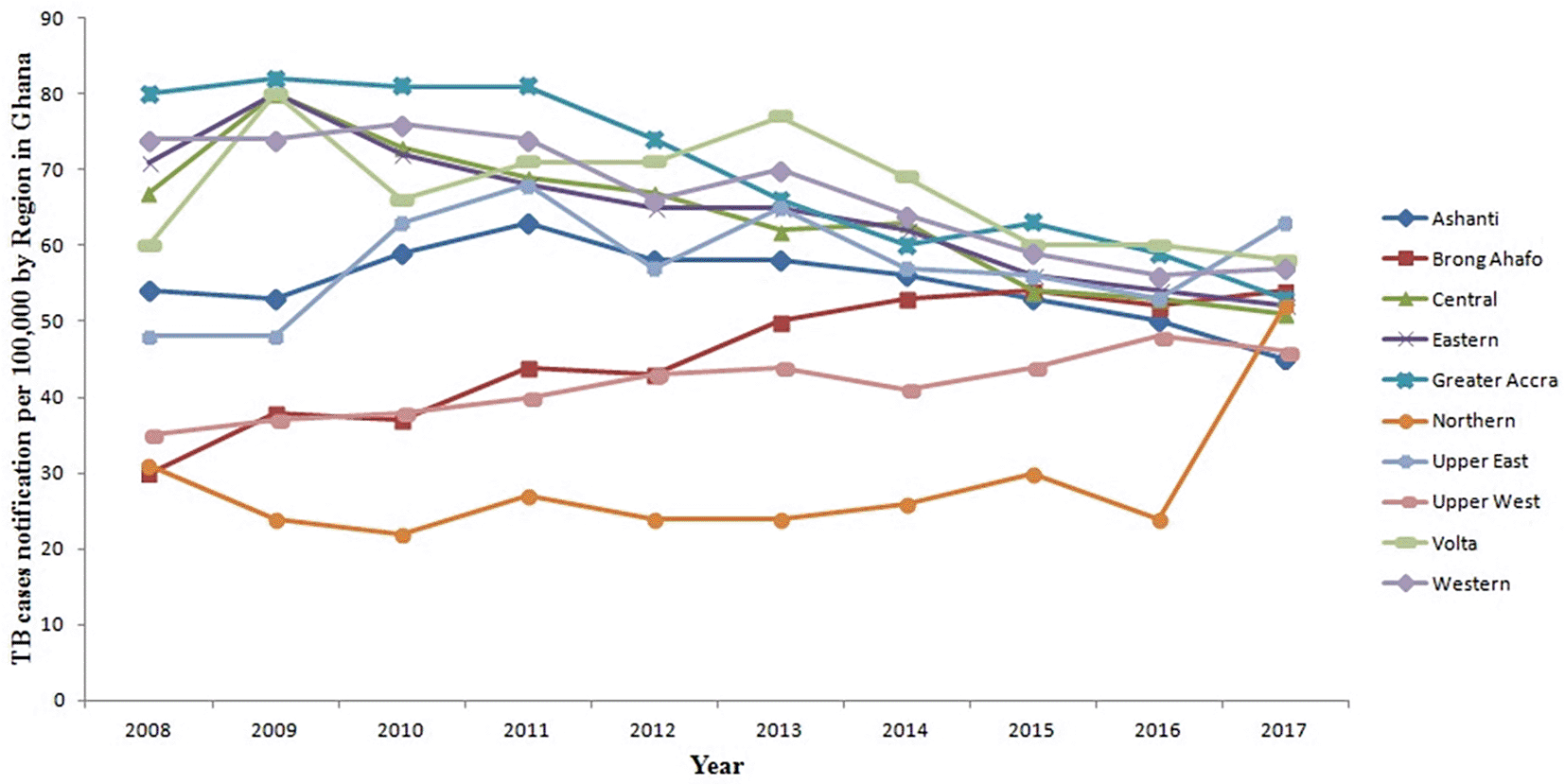 Ghana has been affected by the respiratory disease and currently has challenges in eradicating TB. In response, the country implemented policies such as Directly Observed Therapy (DOT) and National Tuberculosis Programmes (NTPs) in 1994 to detect and treat TB.1,7,8 The initiation of the NTP resulted in 100% DOTs coverage by 2005, leading to an increased detection of TB cases for treatment each subsequent year.9,10 For example, the number of TB cases detected rose from 7,425 in 1996 to 15,286 in 2009.9,10 A more in-depth exploration of TB statistics in Ghana can be found in references.1,7–13 The incidence of tuberculosis (TB) has demonstrated a consistent decline, with figures decreasing from 45,000 cases in 2010 to 44,000 in 2017. Annually, approximately 44,000 individuals develop TB in Ghana, with an estimated 6,600 being children. The number of TB patients undergoing treatment ranged between 14,607 and 15,389 from 2010 to 2017, highlighting a pressing demand for increased resources dedicated to TB patient care. In 2013, the national TB prevalence was estimated at 290 cases per 100,000 population, indicating a burden fourfold higher than the World Health Organization’s (WHO) estimates for the same year (71 cases per 100,000 population). TB-related mortality is estimated at 10,000 deaths annually. Tuberculosis is the seventh leading cause of mortality in Ghana, contributing to 4.9% of all deaths and older males, aged above 45 years, bear the greatest burden of the disease. Also, TB ranks 7th among the leading causes of death for females and 8th for males, and it stands as the 4th primary cause of mortality within the category of communicable, maternal, neonatal, and nutritional diseases. The TB epidemic exhibits a generalized pattern, albeit with geographical variations in case notification, often associated with disparities in access to healthcare facilities.