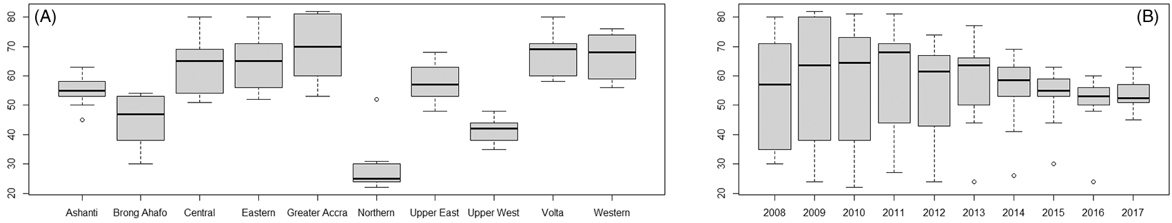 Moreover, the variability of tuberculosis (TB) cases from 2008 to 2017 is illustrated through box-and-whisker plots in Figure 5. The overlapping box-and-whisker plots in Figure 5A suggest a lack of variability in TB cases across the years. These plots indicate a skew towards larger numbers from 2008 to 2014, shifting towards smaller numbers from 2015 to 2016. Particularly small numbers were noted in 2013, 2014, 2015, and 2017. Figure 5B presents the variability across regions. The non-overlapping box-and-whisker plots signify variability in TB cases among the regions. Additionally, it is observed that TB cases in most regions are skewed towards larger numbers, except for the Northern and Upper East regions.