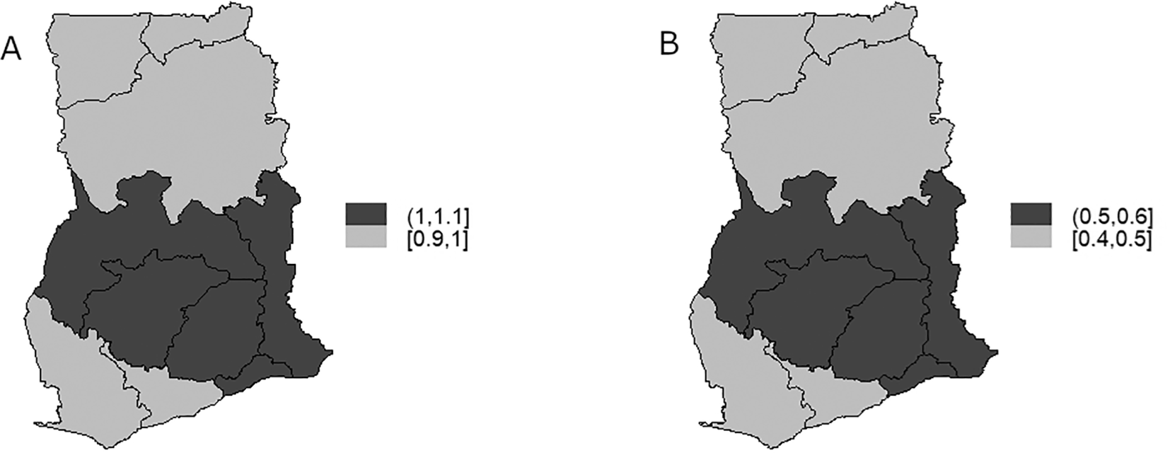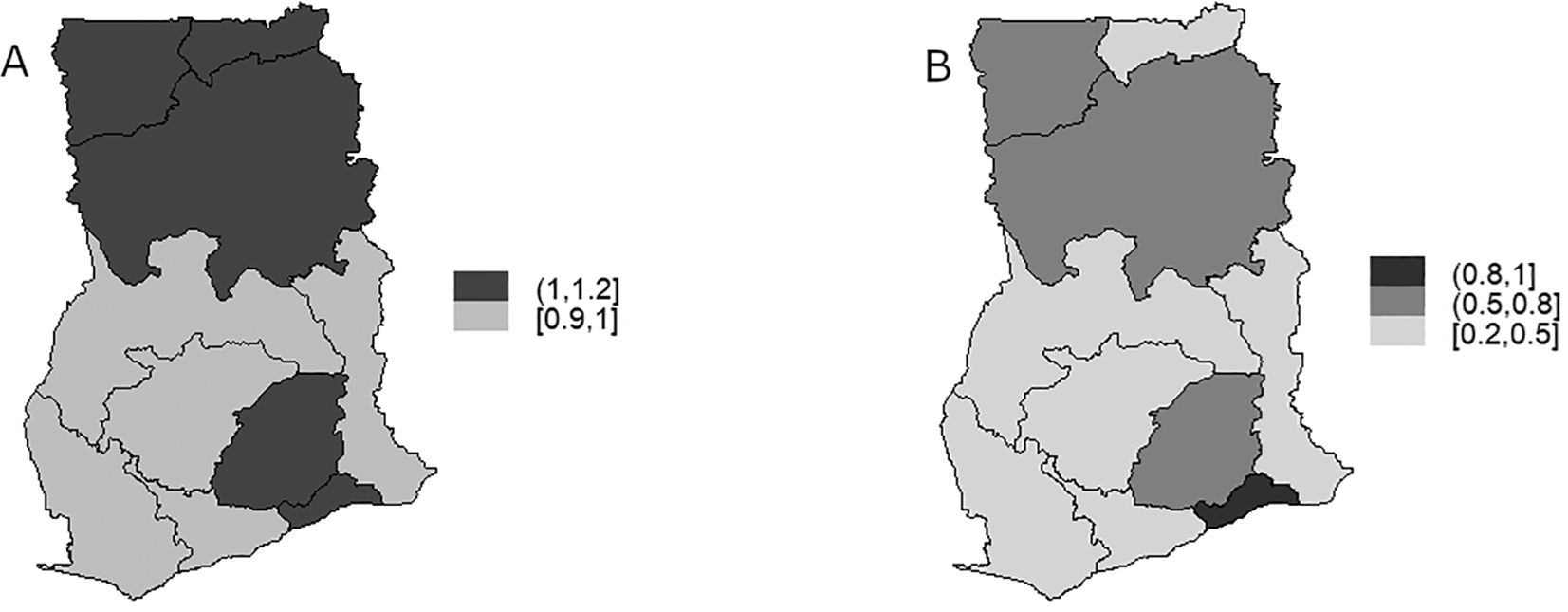 Figure 6A displays the map depicting the posterior mean for the region-specific relative risk of TB infection, while Figure 6B presents a map indicating the excess risk of TB. It can be observed Figure 6A that high risk of TB infection is distributed towards the Northern part of Ghana ranging between 1-1.2 for Upper East, Upper West and Northern regions. High risk of TB infection can be observed in Eastern and Greater Accra regions in the Southern part of Ghana. It can be observed in Figure 6B that Greater Accra region is the region with the highest probability of risk (0.8-1) exceeding the national risk 1 followed by Upper West, Northern and Eastern regions with risk between 0.5-0.8 and lowest risks (0.2-0.5) are observed in Upper East, Brong-Ahafo, Western, Volta, Ashanti, and Central regions.