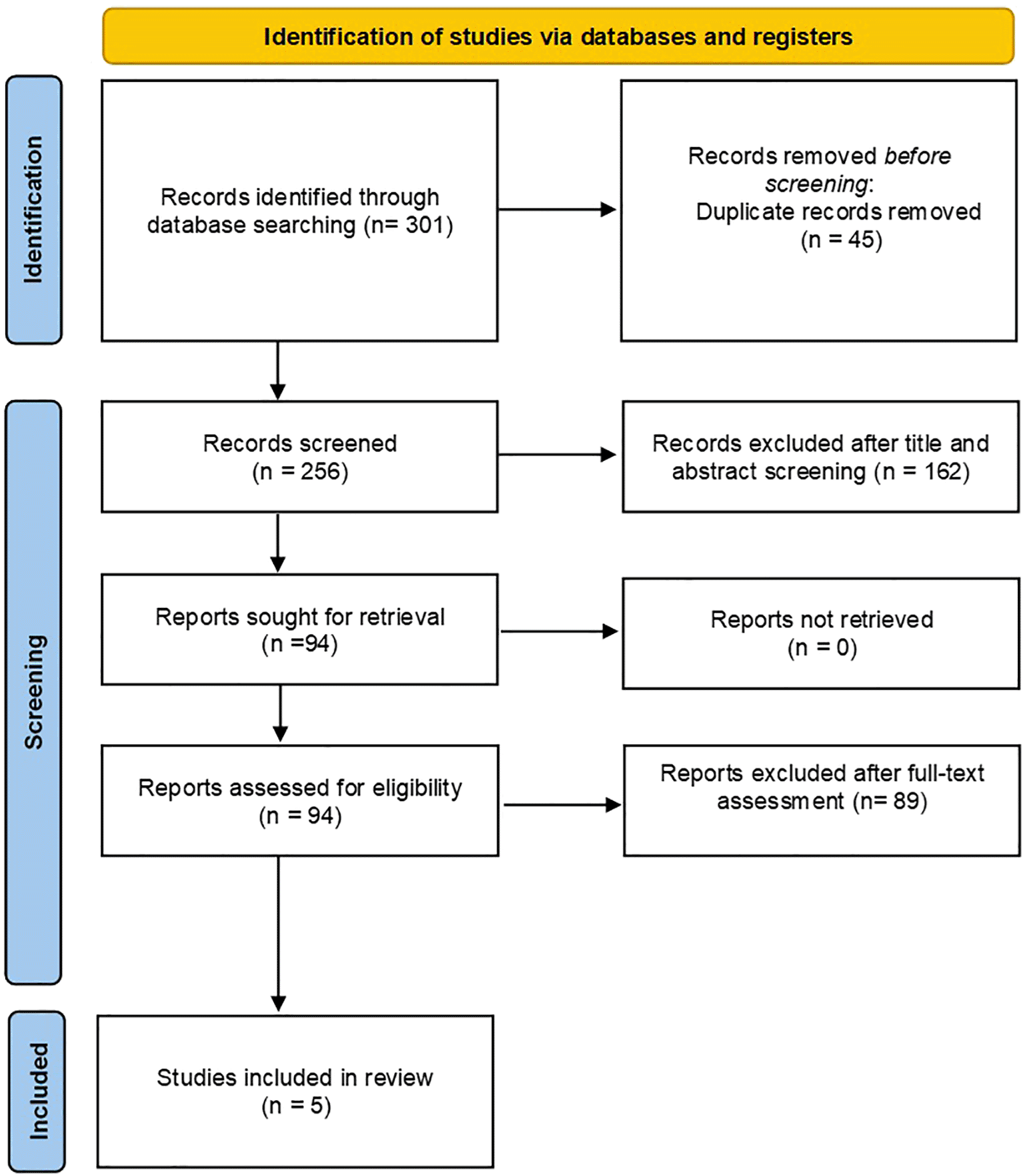 A total of 301 study articles resulted from the initial systematic search. Rayyan (QCRI) identified and removed 45 duplicates from these results. Following the title and abstract screening, 162 studies were removed either due to irrelevant findings, inappropriate research type, or design, followed by the full-text assessment and removal of an additional 89 studies due to irrelevant analysis or wrong outcome. This eventually resulted in a total of 5 eligible studies. The selection process and identification are presented in Figure 1.