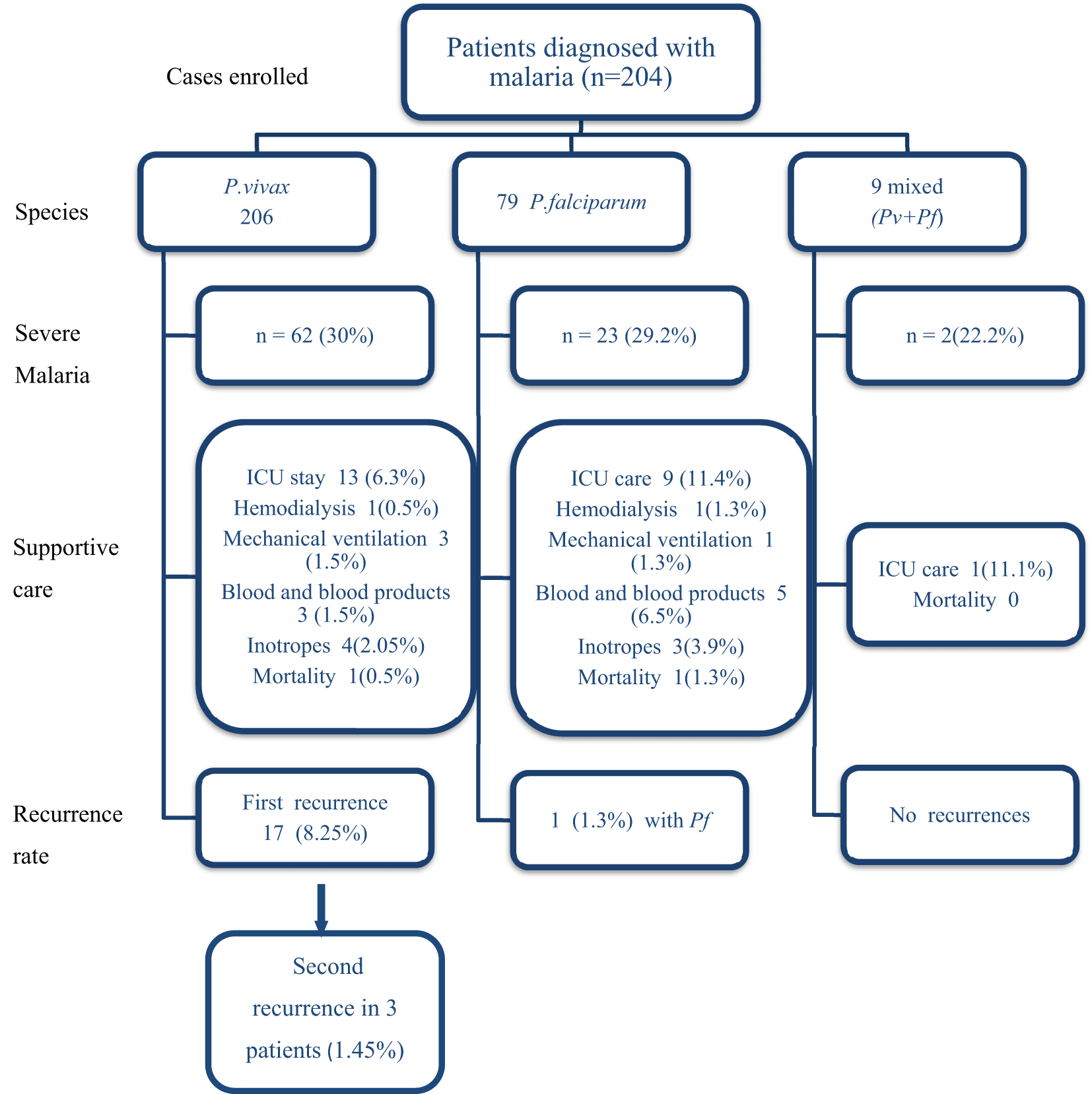 A total of 294 malaria cases were enrolled during the study period, of which 206 (70%) were Pv, 79 (27%) were Pf, and 9 (3%) were mixed (pv+pf). A total of 29.6 % (87/294) cases had severe malaria. The proportion of severity, the requirement of supportive care, and mortality were comparable in both groups and summarized in Figure 1. The baseline clinical and laboratory features of patients with Pv and Pf malaria have been summarized in Table 1.