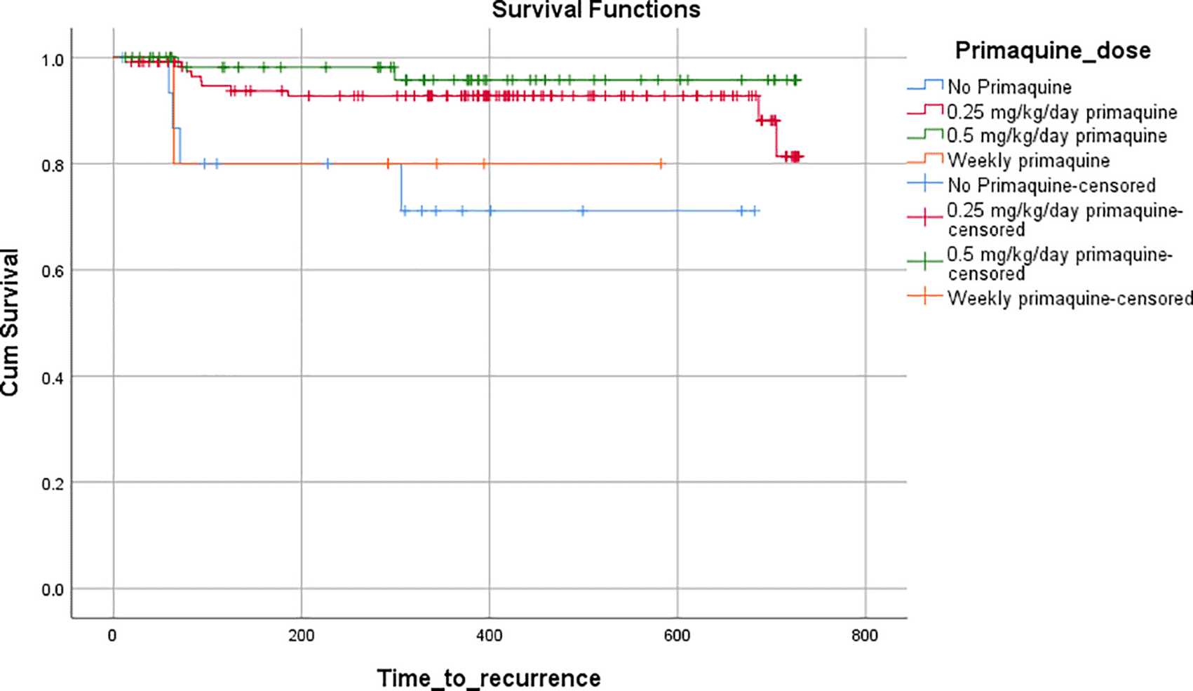 Statistical analysis was performed using Statistical Package for the Social Sciences version 23.0 (SPSS, RRID:SCR_002865, http://www-01.ibm.com/software/uk/analytics/spss/). Continuous variables were summarized as mean with standard deviation (SD) or median with interquartile range (IQR) (in skewed data). Categorical variables were summarized as the frequency with proportion. Overall, patients with Pv were divided into four groups according to PQ dosage- no PQ, weekly PQ, low dose daily PQ (0.25 mg/kg/day), and high dose daily PQ (0.5 mg/kg/day). The number of recurrences in each group were calculated. A Kaplan-Meier survival plot was generated to determine the survival function of recurrences according to PQ categories until 23 months' follow-up duration. Log-rank test was used to compare the survival function. A Chi-square test was used to compare qualitative variables, whereas an independent t-test was used to compare quantitative variables. A p-value of less than 0.01 was considered significant.