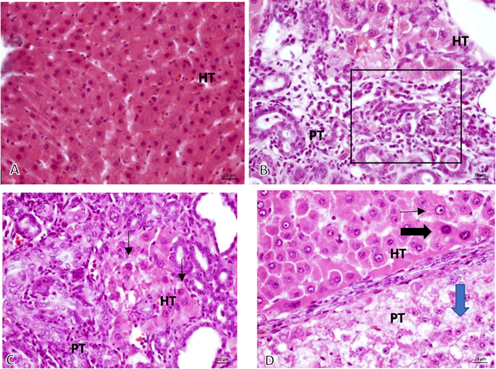 Microscopic 40× magnification on non-induced Diethyl-Nitrosamine (DEN) group: (A, Group K) normal hepatocyte; comparing graphic on DEN induced group: (B, Group O) Bile Duct hyperplasia (Black square area); (C, Group X1) Hyperchromatic cells (black-arrow) and (D, Group X2) Prominent cell (thin-arrow), Hyperchromatic cell (thick black – arrow), Ballooning degeneration (Blue-Arrow). HT, Hepatocyte; PT, Porta tract.