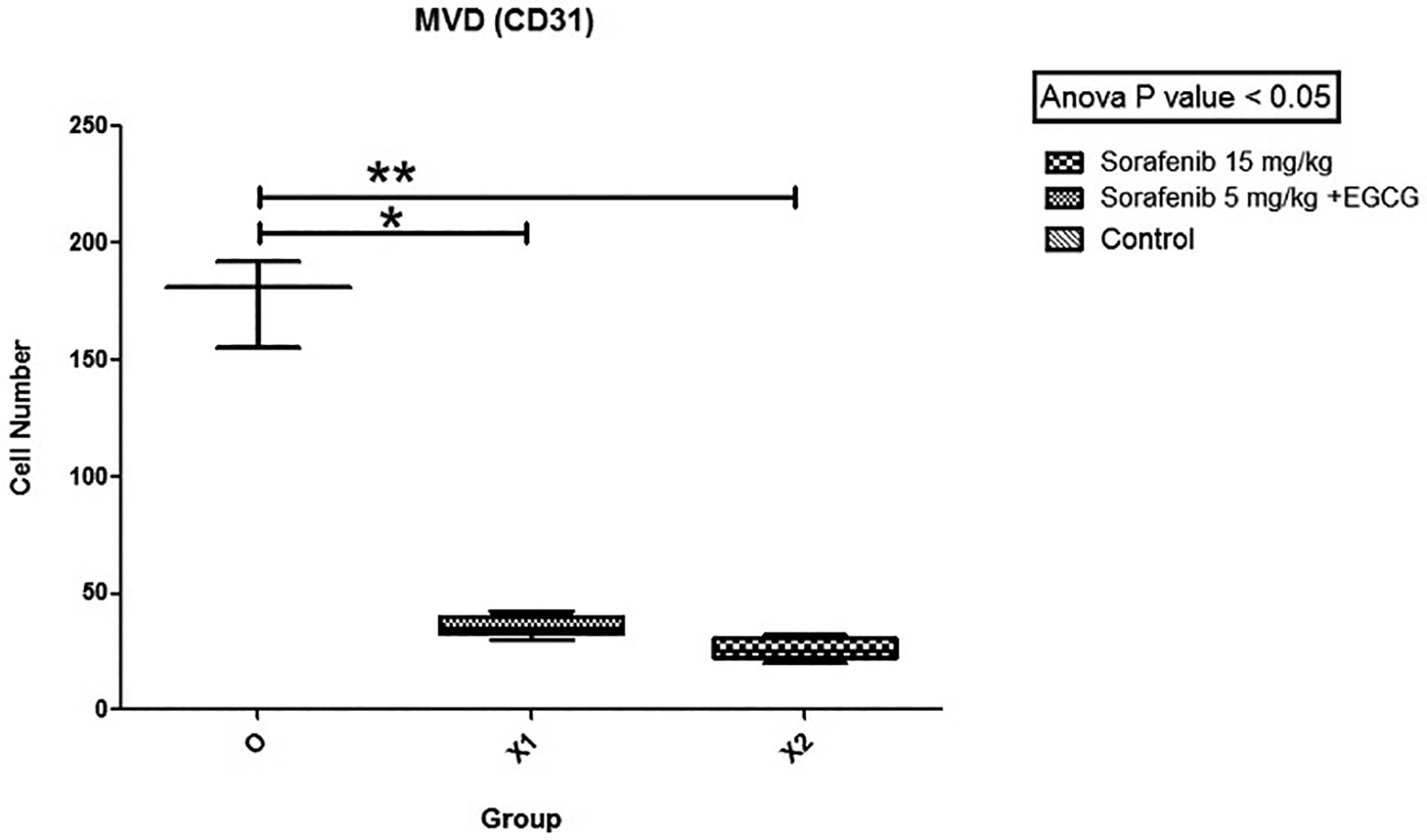 MVD expression was significantly different between X1 and X2 groups compared to group O. This showed that the combination of low-dose Sorafenib and EGCG is also effective as standard-dose Sorafenib-only by decreasing MVD expression intratumorally. However, there is no significant difference in the discovery of MVD expression between the X1 and X2 groups. These are influenced by time length because the formation of MVD is affected by the growth of the capsule in the tumor. This is in line with the results by Kuczynski EA et al., who showed that therapy with Sorafenib significantly inhibits MVD (p < 0.001 vs. controls), while the Sorafenib-resistant group showed no evidence of continued angiogenesis.24 The evaluation of MVD expression is critical to determine the prognosis. According to Poon RTP et al., MVD-CD34 tumors were the only significant predictor of disease-free survival in patients with HCC or tumor size < 5 cm.25