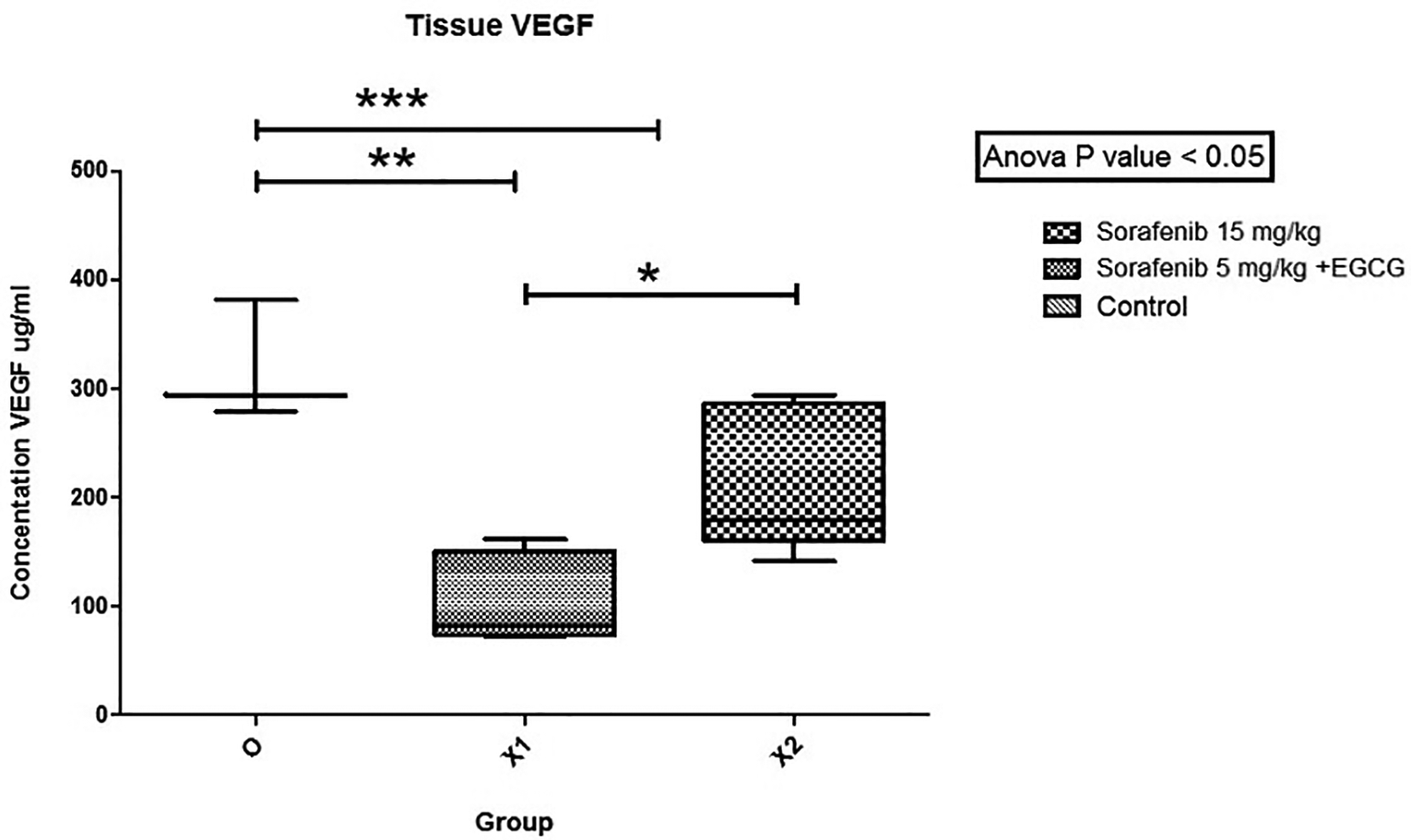 The mean VEGF level (Figure 4) between group Sorafenib 5 mg/kg BW + EGCG 5 mg/kg BW (X1) (106.682 ± 41.024) and group Sorafenib 15 mg/kg BW (X2) (214.5162 ± 67.717) had significant difference (p < 0.05), which showed that group X1 had the most potent effect in reducing VEGF level. Furthermore, the VEGF levels between group X1 and the group without treatment (O) (318.101 ± 55.078) were significantly different (p < 0.05). A similar result was seen since the VEGF level between groups X2 and O were quite different (p < 0.05).