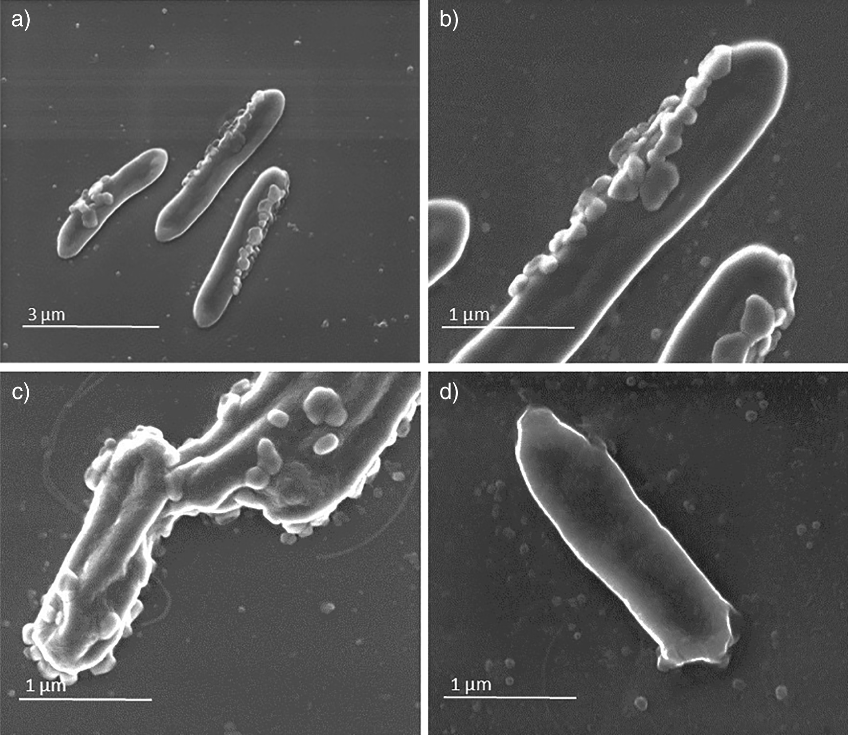 Panels a (magnification ×20,000), b (magnification ×80,000), and c (magnification ×80,000) (sample A) show virus-like particles on bacteria surface. Panel d (magnification ×80,000) shows the sample B used as control.