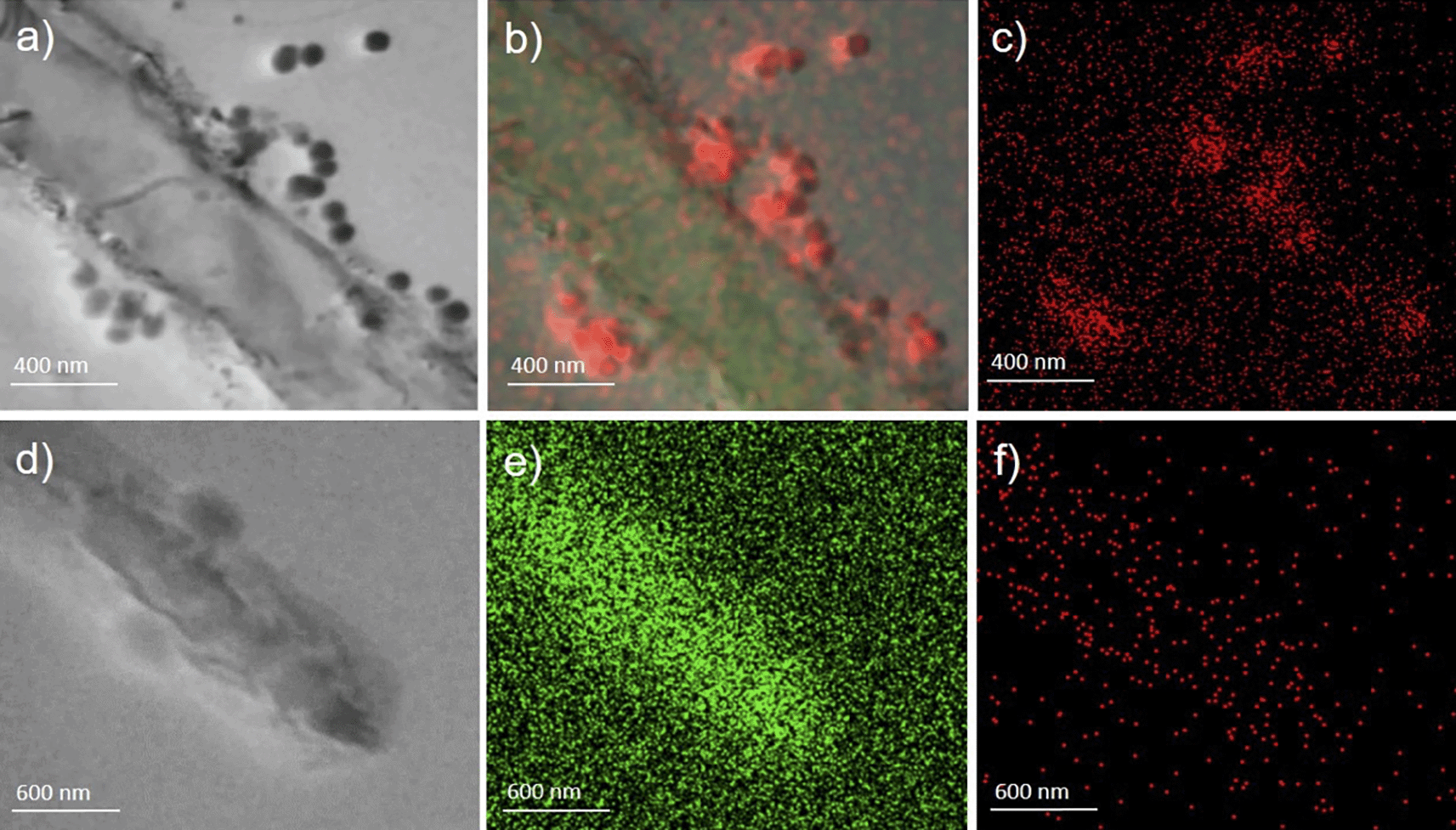 Panels a, b, and c (magnification ×80,000) (sample A) present whole bacteria fixed and dehydrated in the presence of virus-like particles on their surface strictly attached and interacting with the wall (panel a, acquisition in bright field). Each particle contains a high amount of phosphorus (red in panels b) as compared to the background; carbon is also present in (green in panel b) Panels d, e, and f (magnification ×60,000) show the same acquisition made on sample B used as control (d=bright field; e=carbo; f=phosphorus).