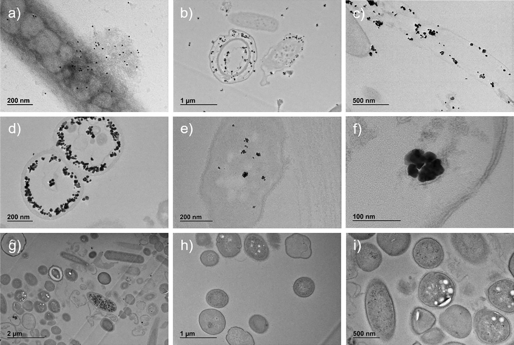 Presence of SARS-CoV-2 nucleocapsid protein conjugated with secondary Ab-gold 10 nm in whole bacterium (panel a, magnification ×20,000) and conjugated with secondary Ab NANOGOLD enhance in bacteria ultrafine slices (panels b, magnification ×6,000; c, magnification ×12,000; d, magnification ×20,000; e, magnification ×25,000; f, magnification ×80,000). Ultrafine slices of negative control (Sample B) do not show significant presence of SARS-CoV-2 nucleocapsid protein (panels g, magnification ×3,000; h, magnification ×6,000; i, magnification ×8,000).