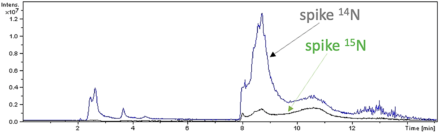 2. Natural nitrogen-14 (14N) and nitrogen-15 (15N) isotopes, usually employed in metabolomics, proteomics and genomics functional studies,15,16 were used to monitor the virus proliferation. Sample A was grown in presence of 14N, and then 15N was added. Presence of 15N included in the spike protein was tested by performing peptide mapping analysis.