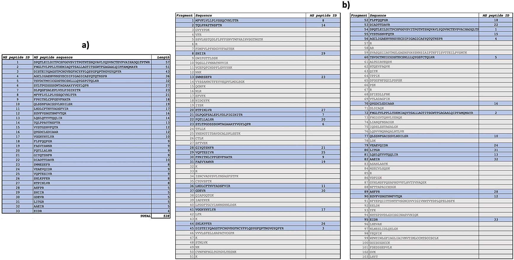 Identified spike peptides labelled with 15N and mapping on the reference spike protein (NCBI Reference Sequence: YP_009724390.1) are listed (panel a). They correspond to fragments obtained from trypsin digestion of the reference spike protein (panel b).