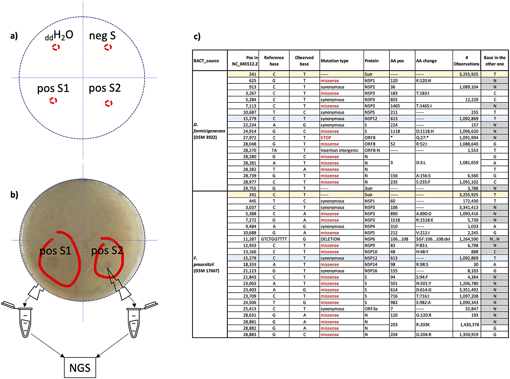a) schematic split of the plates used in the assay in four sectors: ddH2O=double distilled water; negS = control supernatant negative to SARS-CoV-2; pos S1 and pos S2 = supernatants positive to SARS-CoV-2. b) observed plaques (red circled) were individually collected to perform NGS experiments. c) “host specific” nucleic acid changes identified in the two distinct sequence sets (column “BACT_source”): column “# Observations” represents the number of sequences in GISAID that, at the time of the analysis (15/9/2021) showed the same base change; column “base in the other one” indicates the base identified at the same position in the other sequence set; changes found in both sets are highlighted as rows with the same colour.