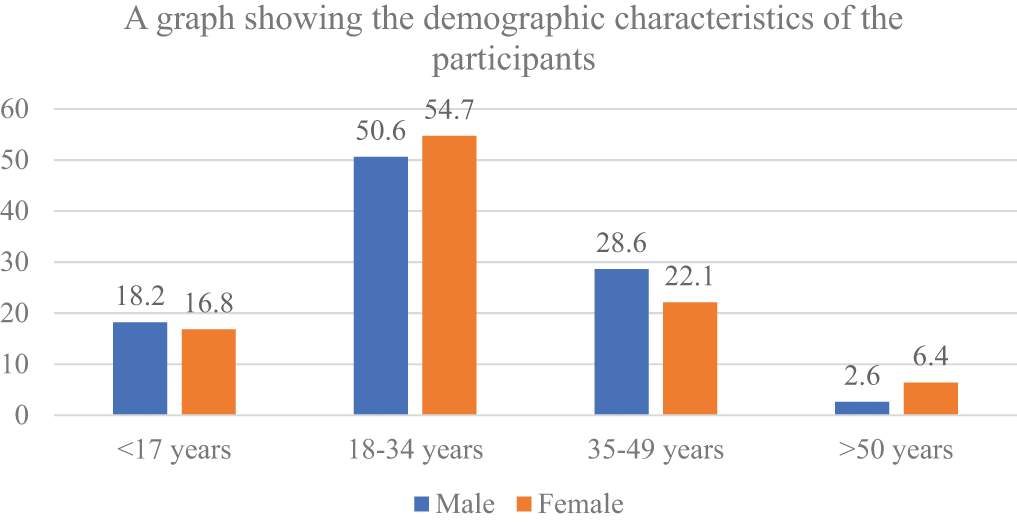 A total of 172 participants, 55% female and 45% male, aged between 17 to 50 years were enrolled for the study. Majority of the participants were aged between 18 and 34 years and few were those above 50 years of age (Figure 1).