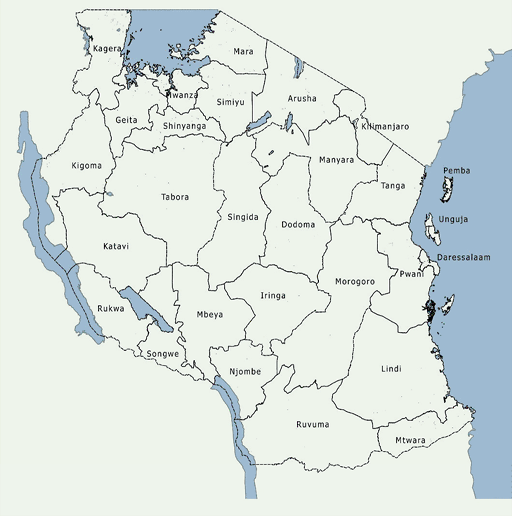 The overall prevalence of stunting for the Tanzania mainland is 33.5%, ranging from 20% in Kilimanjaro to 53.6% in the Njombe region. Basic need poverty stands at 27.5%, ranging from 8% in Dar es Salaam to 45% in the Rukwa region. On the other hand, the average food production is 977,544.80 Metric tons per year and the mean average monthly household food consumption expenditure is 47,986 ranging from 34,354 in Kigoma to 70,966 in Dar es Salaam (see Table 1).