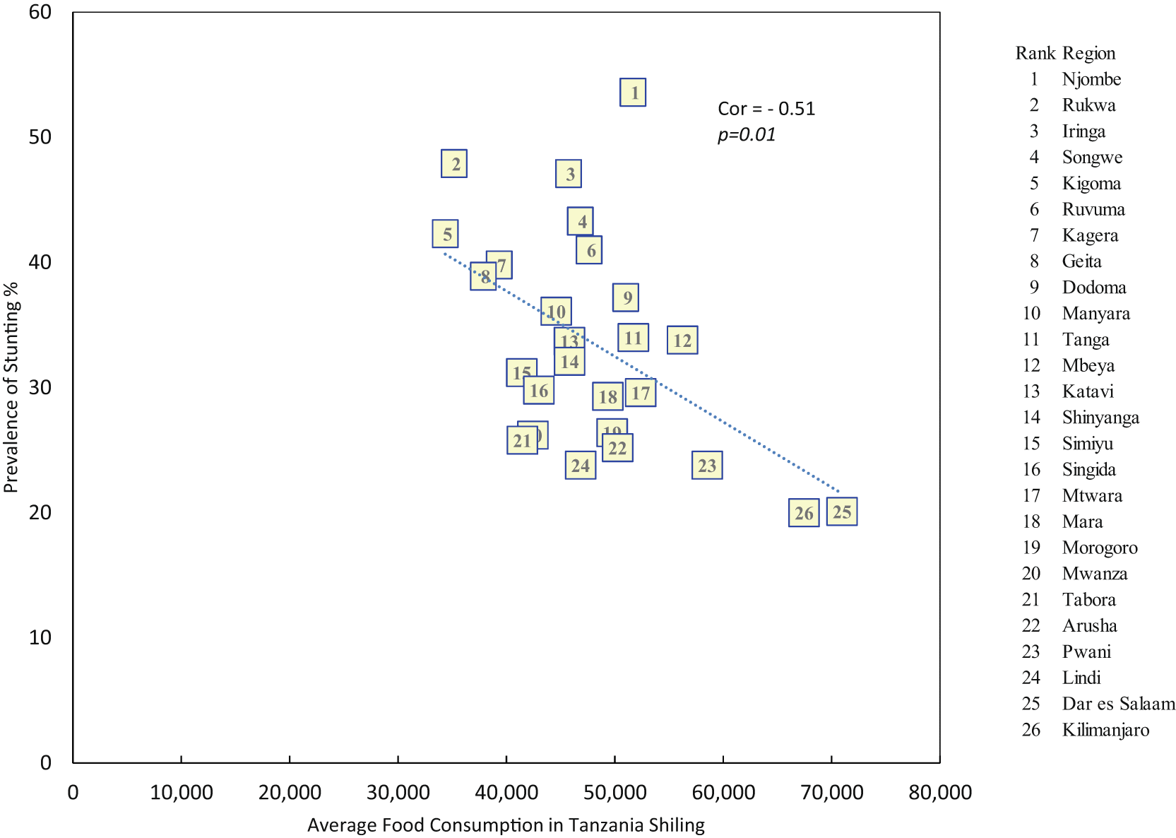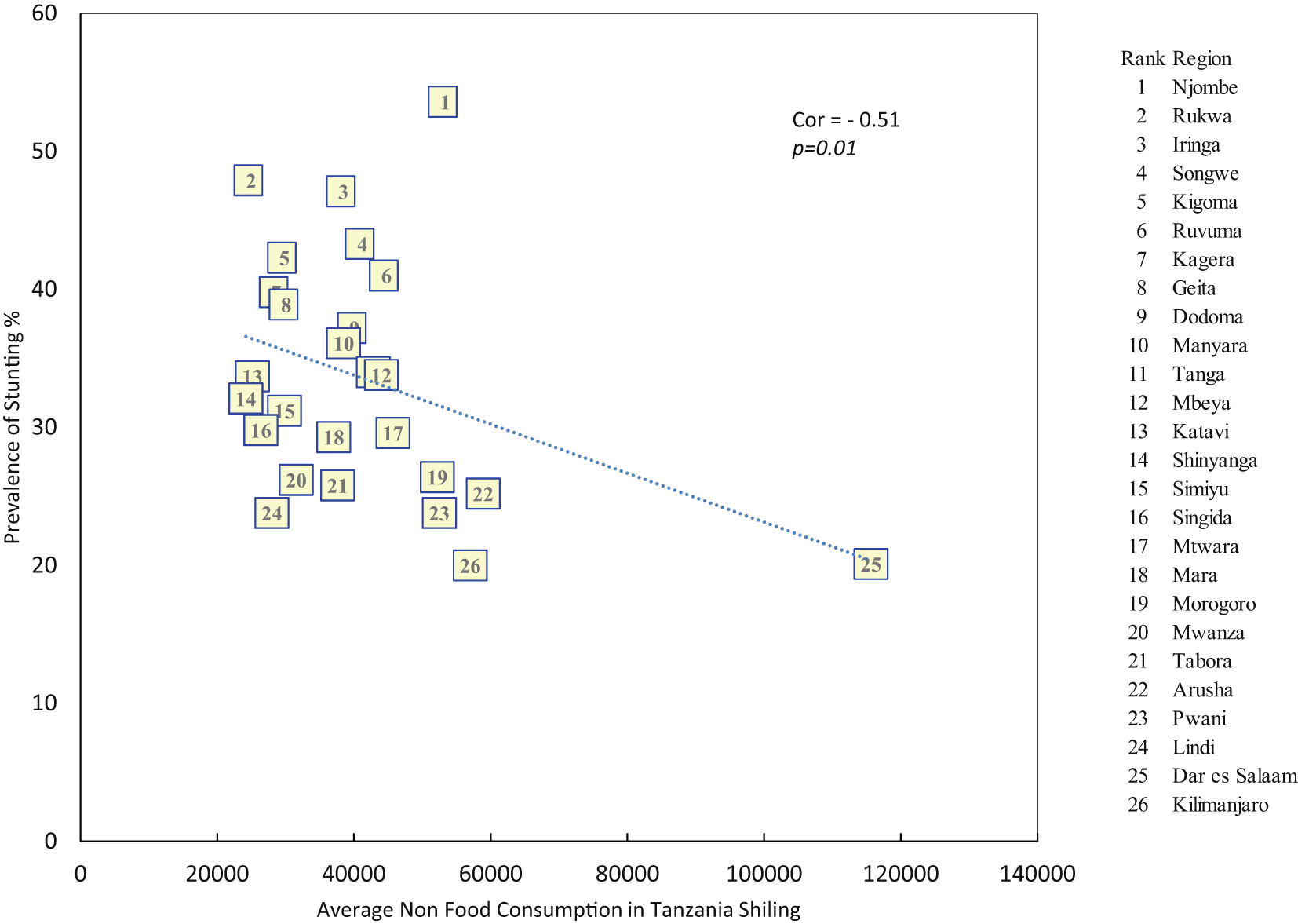 The study showed that there is a positive relationship between the prevalence of stunting and food production (r=0.43, p=0.03), while there is a negative relationship between stunting and the level of both the average monthly household food consumption expenditure (r = -0.51, p = 0.01) and average monthly household non-food consumption expenditure (r = -0.51, p = 0.01). It was further found that some regions which have higher levels of stunting such as Njombe, have the lowest level of basic need poverty.