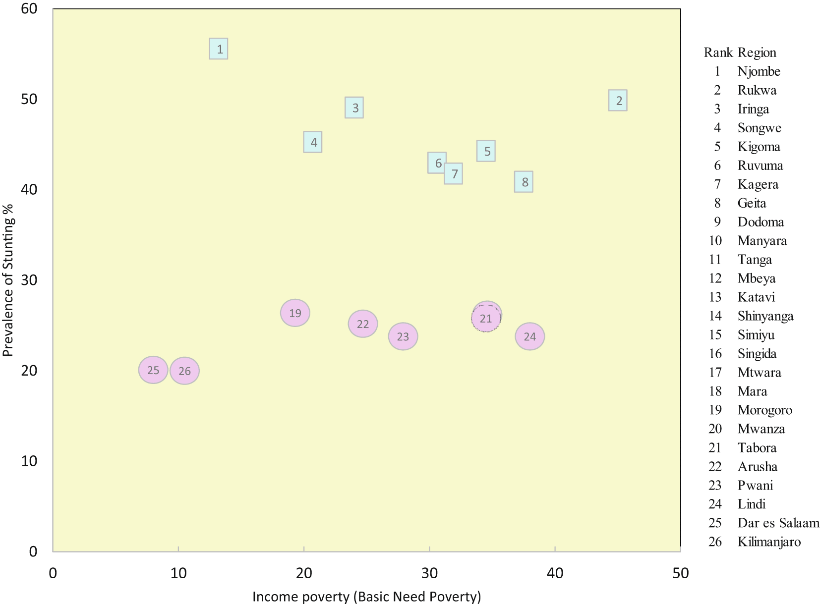 The relationship between stunting and basic needs poverty indicated that Njombe, which is the region with the highest level of stunting in the country (53%), is the region with the third lowest level of poverty (13.2%), next to Kilimanjaro (8%) and Dar es Salaam (10.5%). The prevalence of basic need poverty in Njombe, Iringa and Songwe, with stunting levels above 40%, is lower compared to other regions. However, the level of poverty and stunting in Rukwaa and Geita do not show notable differences. This trend is also observed for the regions with the lowest levels of stunting which are Kilimanjaro, Dar es Salama and Morogoro ( Figure 5).