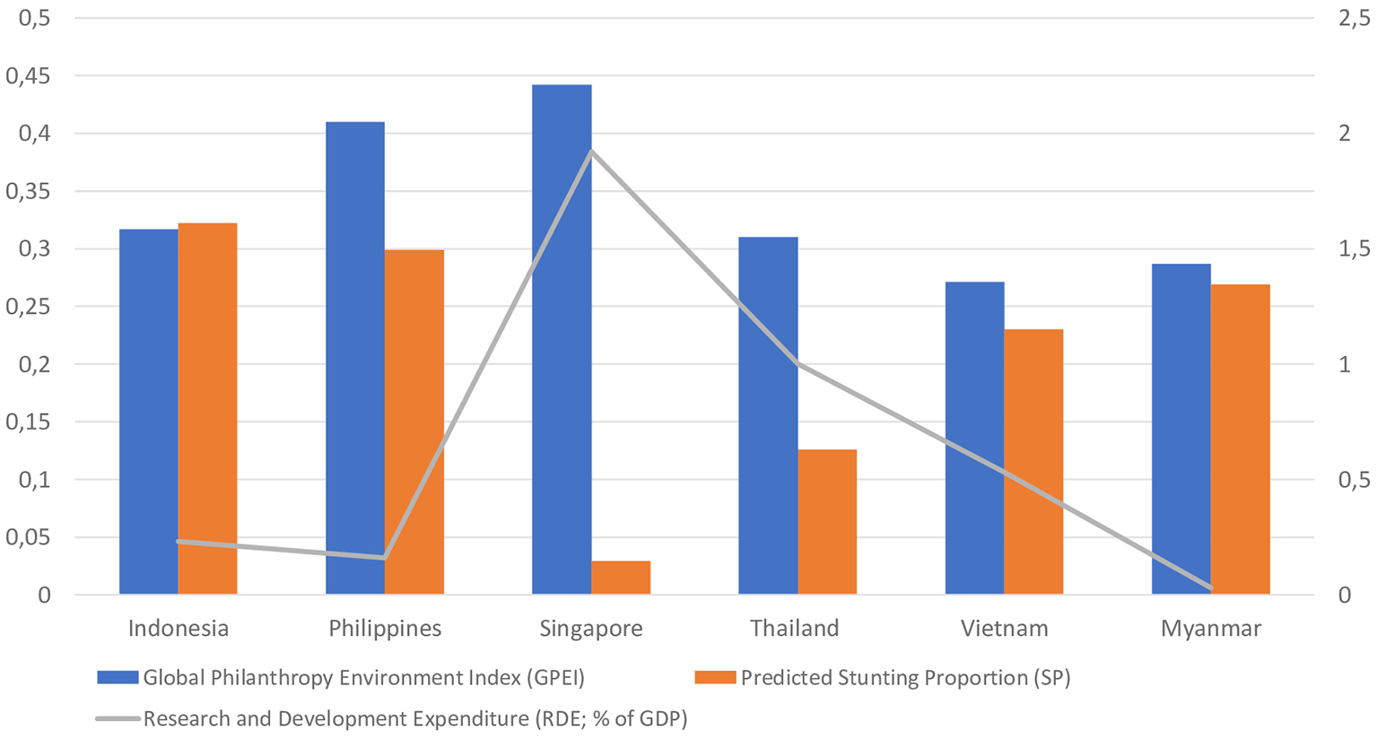 The data used in the policy brief (Figure 1) were based on Southern & Southeastern Asia Region Report 2018 by Indiana University-Purdue University Indianapolis (https://globalindices.iupui.edu/environment/regions/southern-southeastern-asia/index.html); Stunting Survey Estimates 2018 by UNICEF (https://data.unicef.org/wp-content/uploads/2019/04/JME_Country_Estimates_April_2021_v3.xlsx); and Research & Development Expenditure of Philippines, Indonesia, Singapore, Thailand, Vietnam, and Myanmar (https://data.worldbank.org/indicator/GB.XPD.RSDV.GD.ZS?locations=PH-ID-SG-TH-VN-MM&start=2018). We collected the data from trusted or legal database platforms. Indonesia, Philippines, Singapore, Thailand, Vietnam, and Myanmar were chosen to represent Southeastern Asia for the global philanthropy environment index survey. Because of that, we also collected the estimated stunting proportion and research and development expenditure from these 6 countries in order to compare the available data.