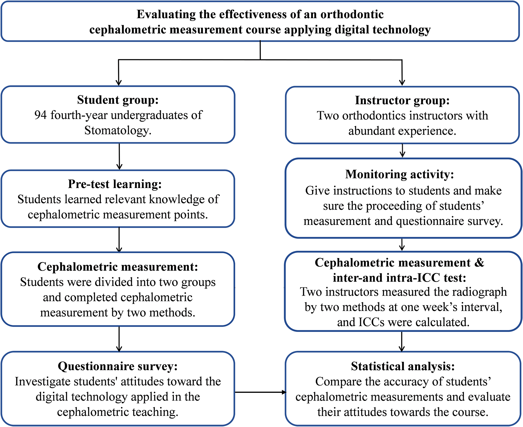 This study was conducted from May 12, 2020 to June 16, 2020. The flow diagram of this pedagogical study was shown in Figure 1. For students, it was divided into pre-test learning, group and cephalometric measurement, and questionnaire survey. For instructors, it was divided into monitoring activity, cephalometric measurement and inter- and intra-class correlation coefficient of their measurements.