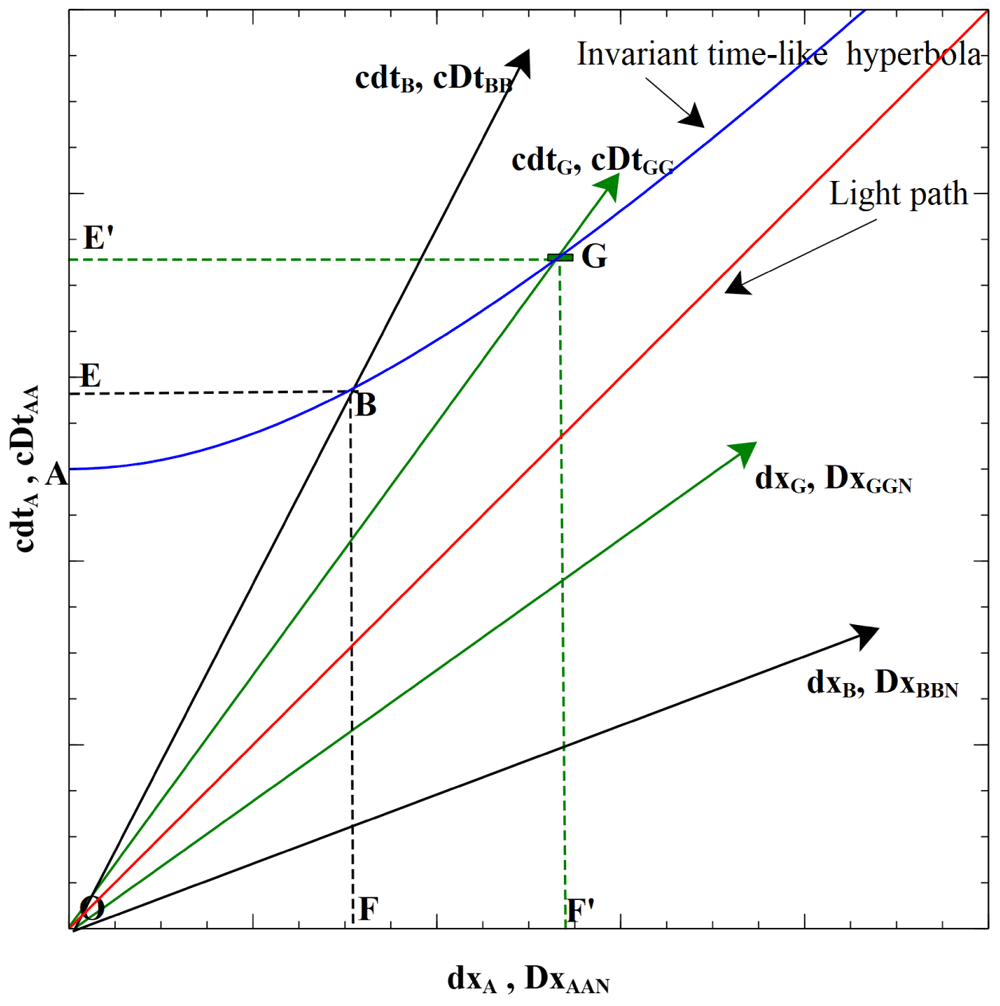 In Figure 1, A is the observer, dxA = DxAAB and dtA = DtAA, while DtAB is the time of a moving clock (B’s) as seen in what an observer considers as stationary axes (A). However, the condition dτ = DtNN can then only occur where the observer and the event or object being observed lie on their respective time axes, e.g. at A, B and G in Figure 1. This condition corresponds to dxN = 0 in Equation (1), and DxNNM = DxNNN = 0 in Equation (3) and Equation (4). The three sets of inertial axes (A, B and G) in this figure are shown from A’s viewpoint. All frames have a common initial location at O. The divisions shown on the axes in the figure are arbitrary.