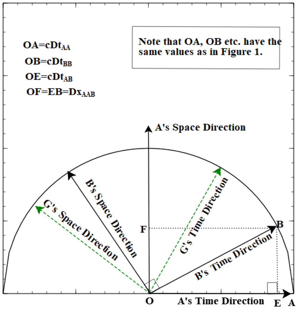In Figure 1 the axes labelled cdtN are the infinitesimal changes in temporal coordinate in inertial frame N in the standard theory, and additionally the continuously changing temporal coordinates constructed by N in the dynamic theory (i.e., DtNN) when comparing events from both his frame, and other inertial frames, to changes in his clock, i.e. OA = cDtAA, OB = cDtBB and OE = cDtAB. Equally dxN is on the axis where position O corresponds to DxAAA = DxBBB = 0, and OF = EB = DxAAB when A measures B’s spatial motion relative to A’s ruler.